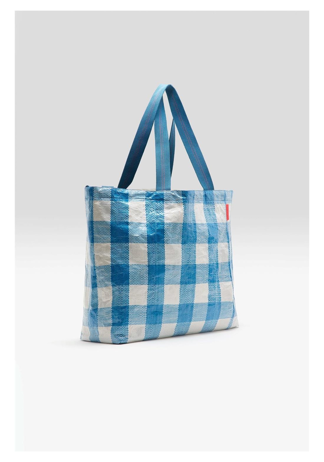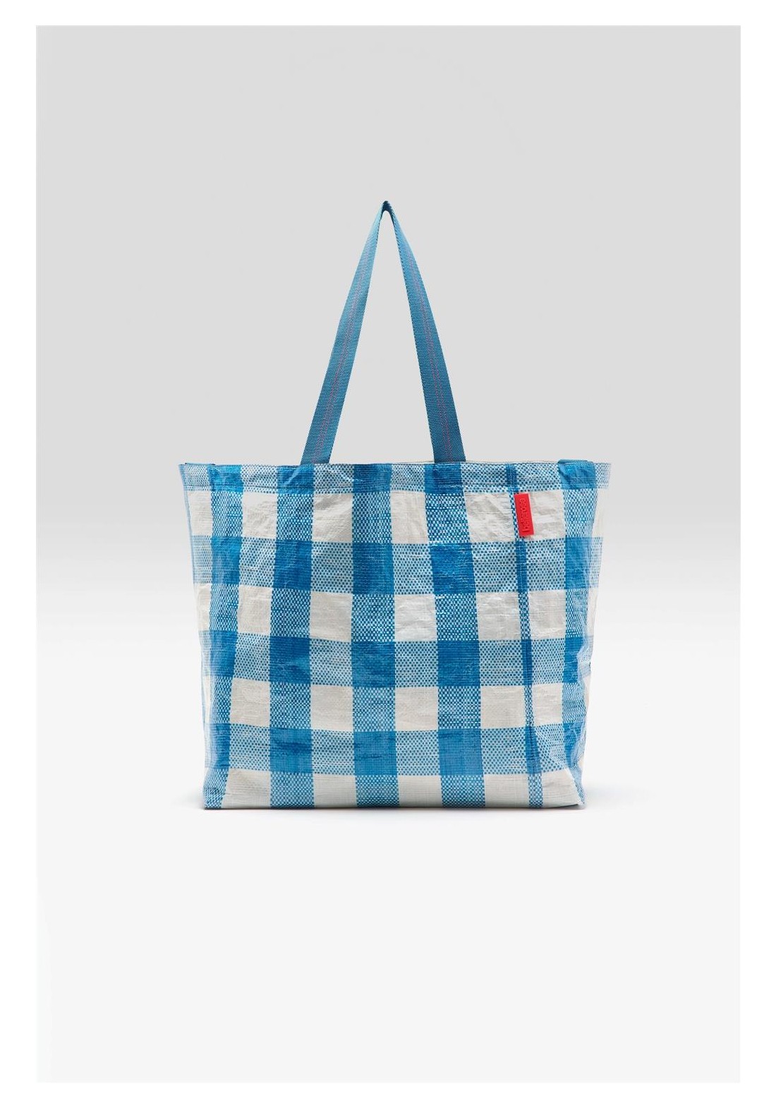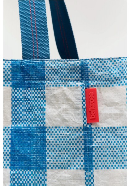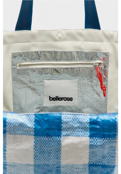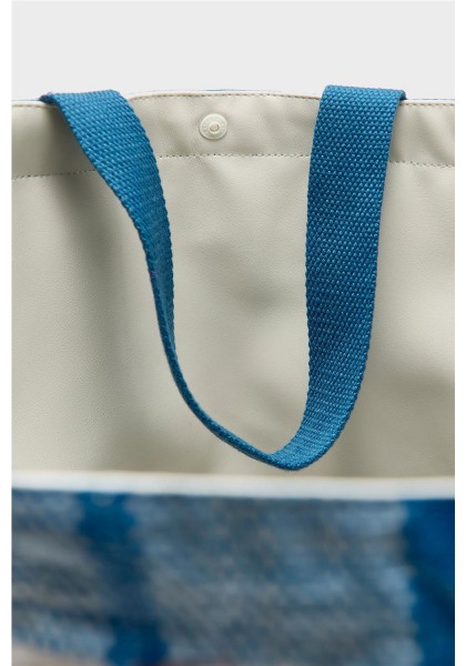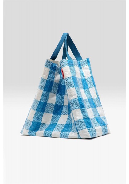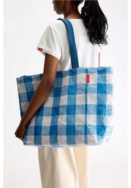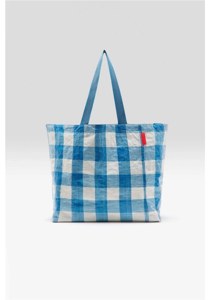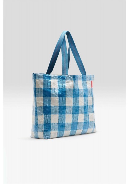 Bolso grande con doble cierre y asas, confeccionado en polipropileno arrugado a cuadros azules y blancos. Compartimento principal amplio. Dos juegos de asas (una corta para llevar en la mano y otra larga para llevar al hombro). Forro de piel sintética blanca con bolsillo interior con cremallera de tejido antidesgarro plateado. Dimensiones: 40 x 60 x 44 cm. Longitud de las asas cortas: 35 cm. Longitud de las asas largas: 65 cm.