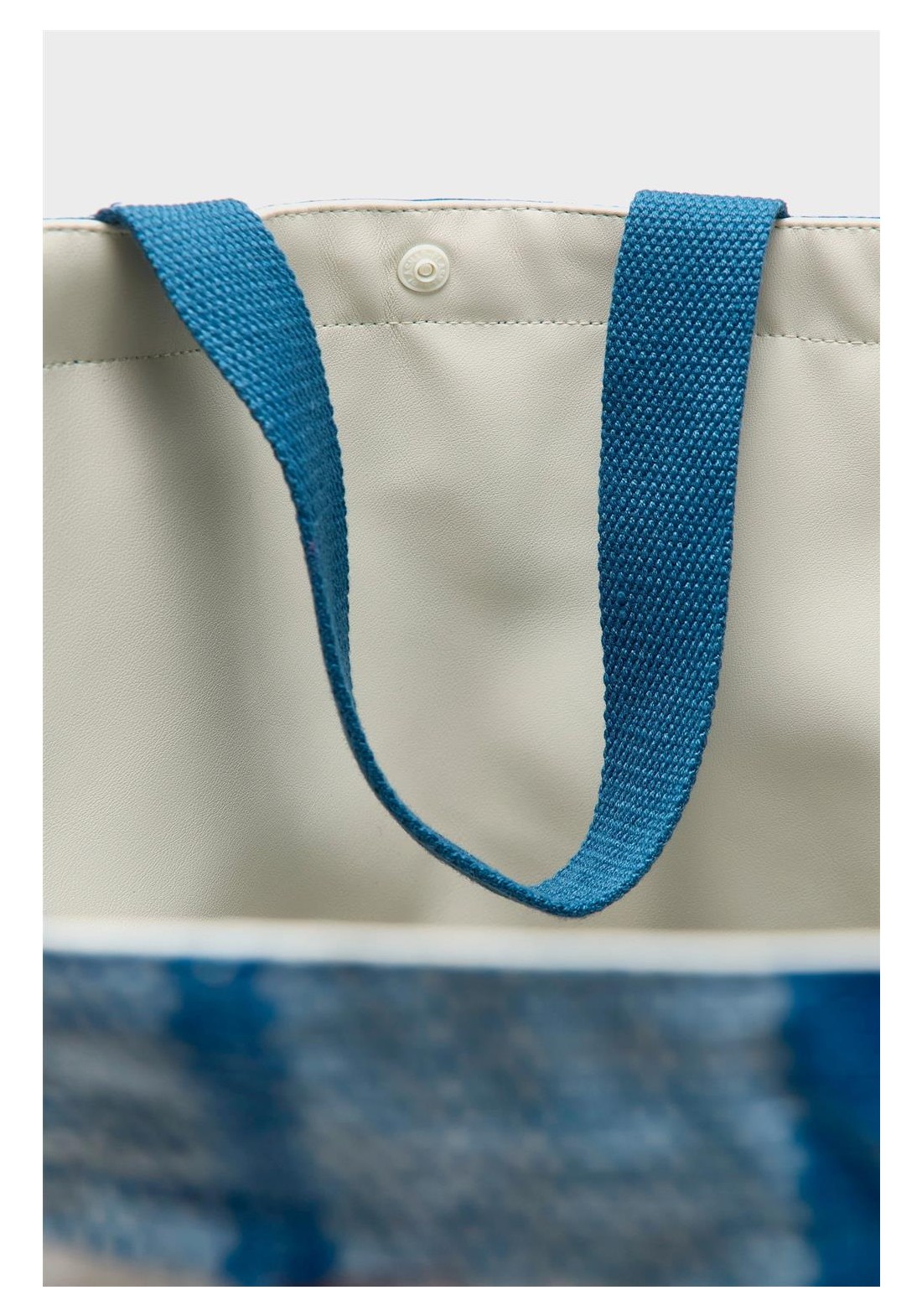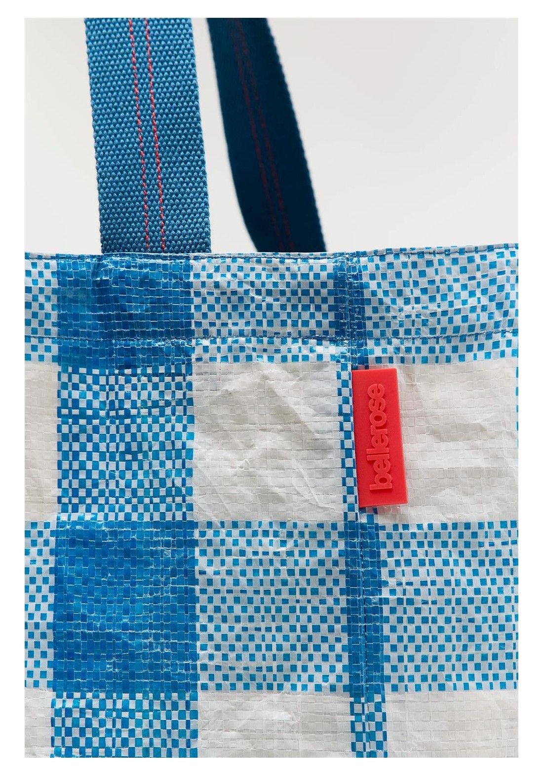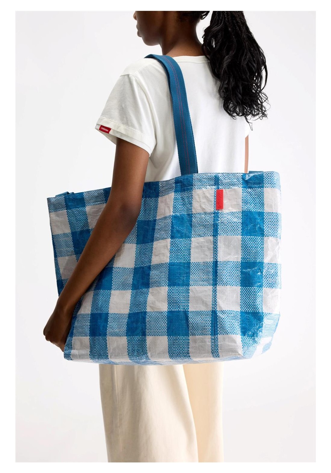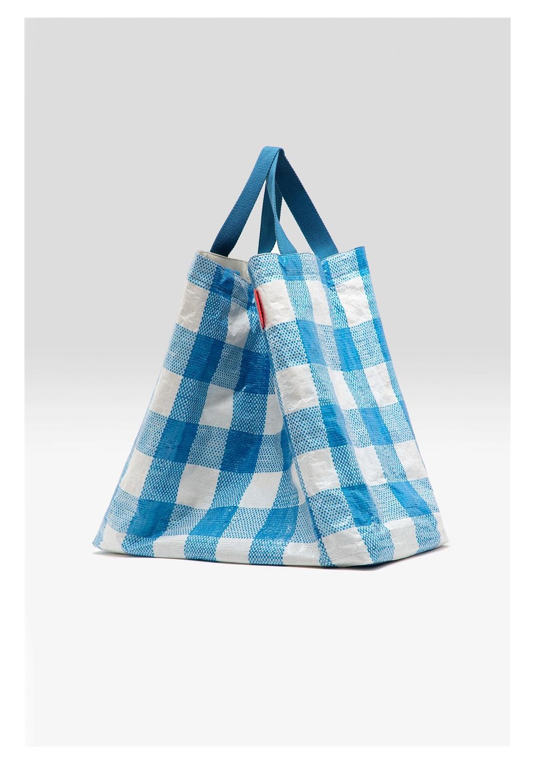 Bolso grande con doble cierre y asas, confeccionado en polipropileno arrugado a cuadros azules y blancos. Compartimento principal amplio. Dos juegos de asas (una corta para llevar en la mano y otra larga para llevar al hombro). Forro de piel sintética blanca con bolsillo interior con cremallera de tejido antidesgarro plateado. Dimensiones: 40 x 60 x 44 cm. Longitud de las asas cortas: 35 cm. Longitud de las asas largas: 65 cm.