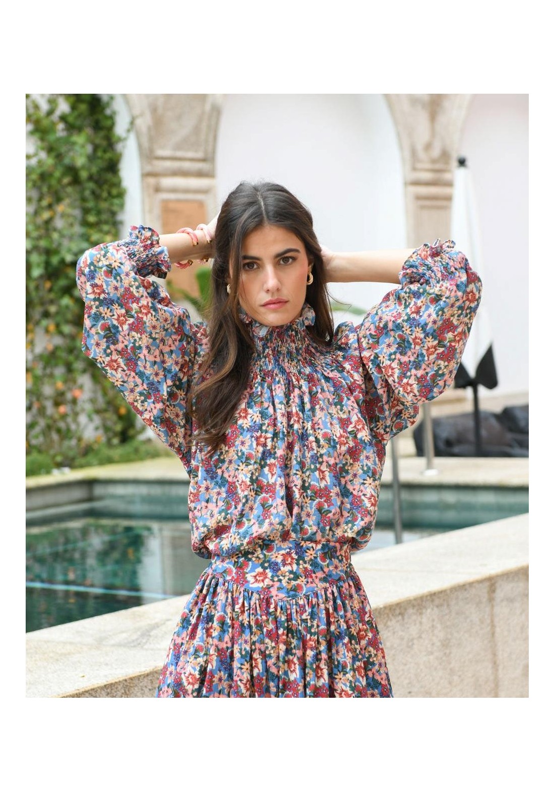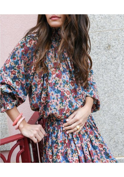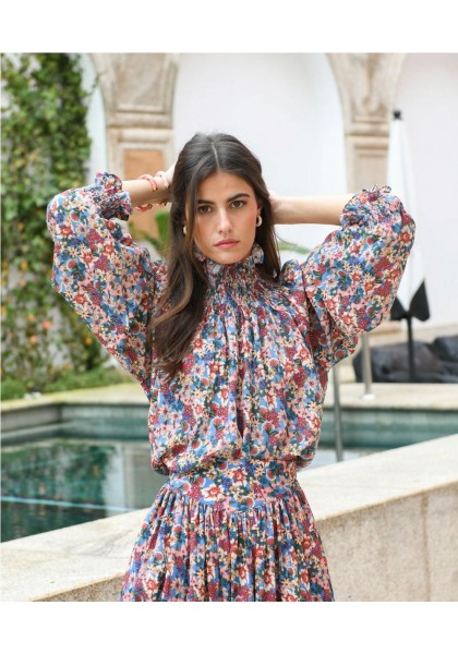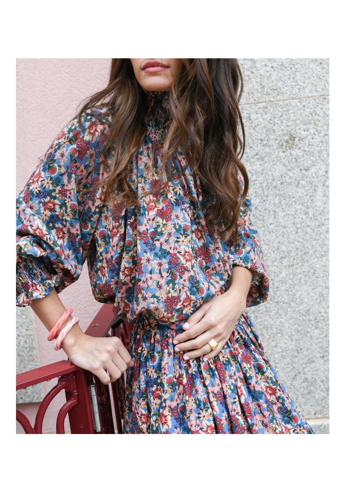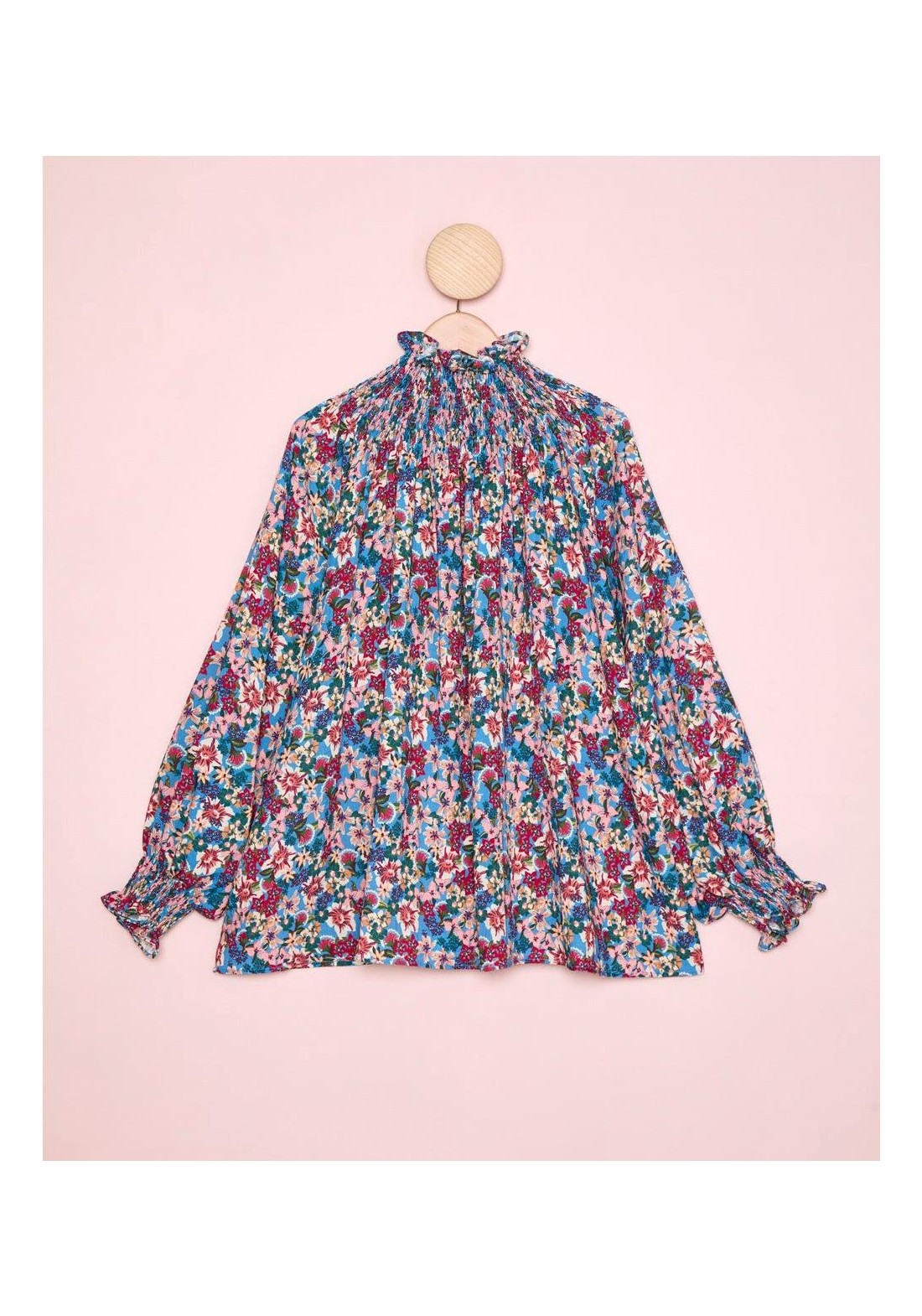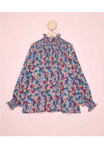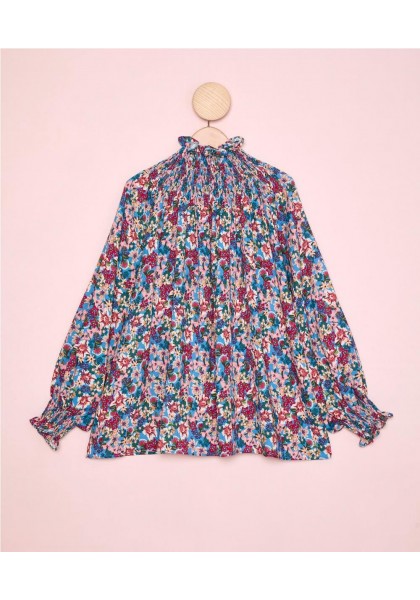 Blusa amplia con cuello fruncido y estampado floral. De manga abullonada y puño elástico, esta prenda combina comodidad con un estilo romántico y sofisticado. Su silueta fluida cae con movimiento natural, mientras que el detalle del cuello aporta un aire elegante y femenino. Confeccionada en 80% viscosa y 20% poliamida.