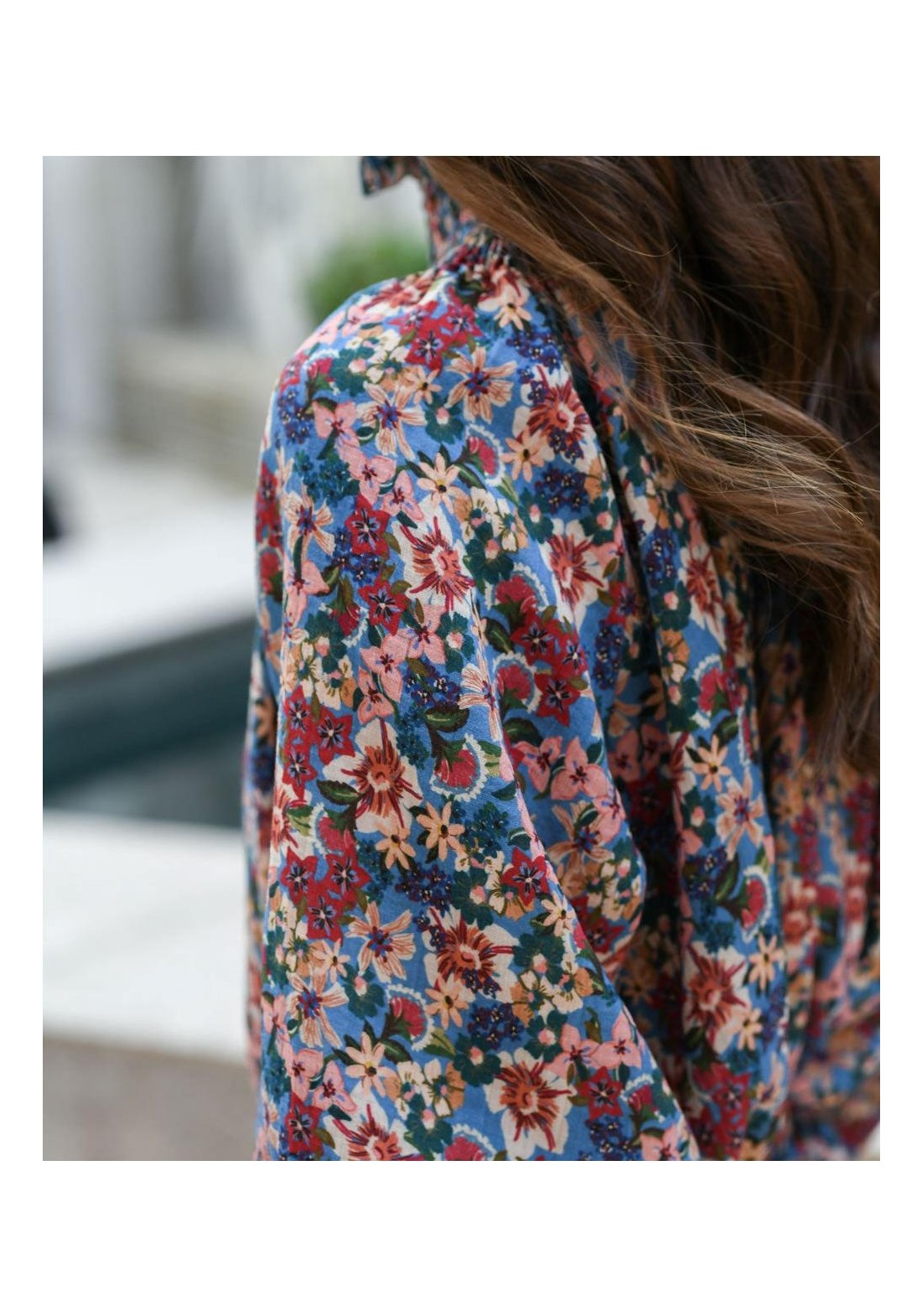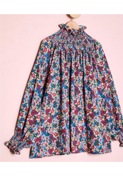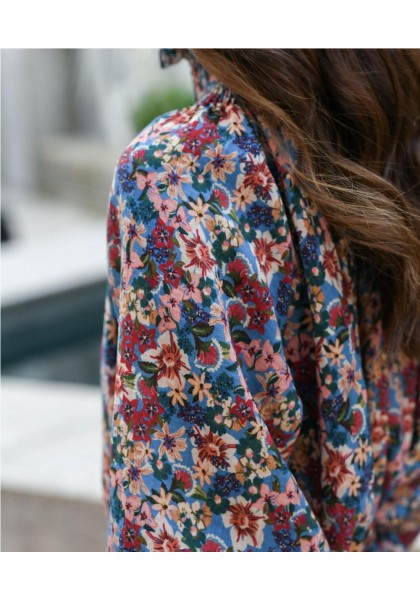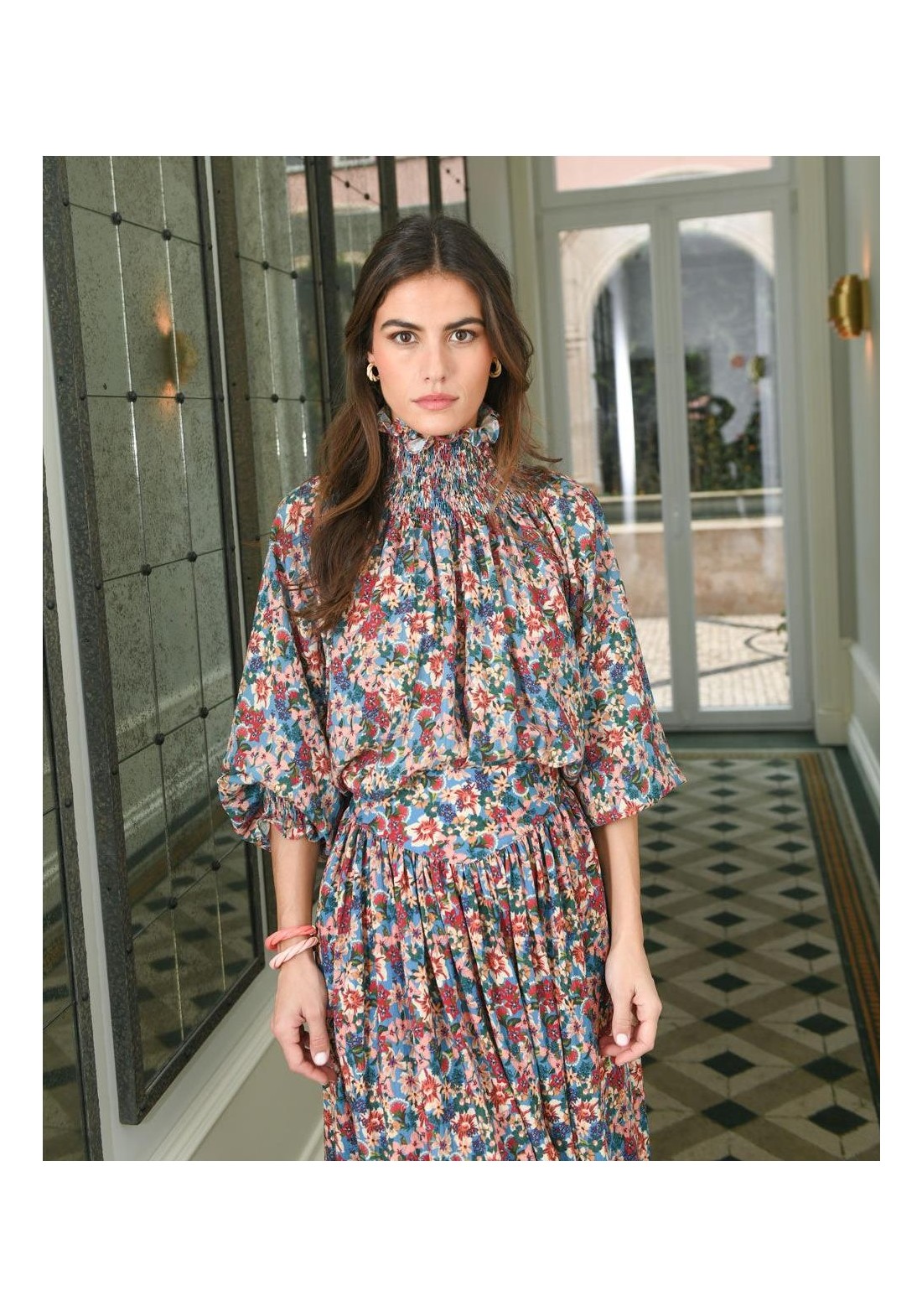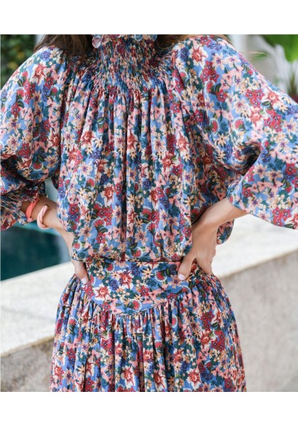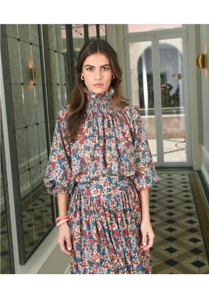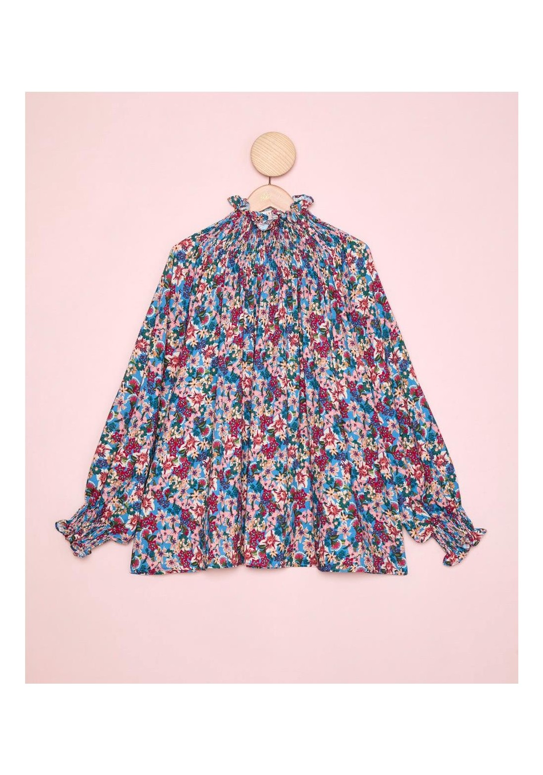 Blusa amplia con cuello fruncido y estampado floral. De manga abullonada y puño elástico, esta prenda combina comodidad con un estilo romántico y sofisticado. Su silueta fluida cae con movimiento natural, mientras que el detalle del cuello aporta un aire elegante y femenino. Confeccionada en 80% viscosa y 20% poliamida.