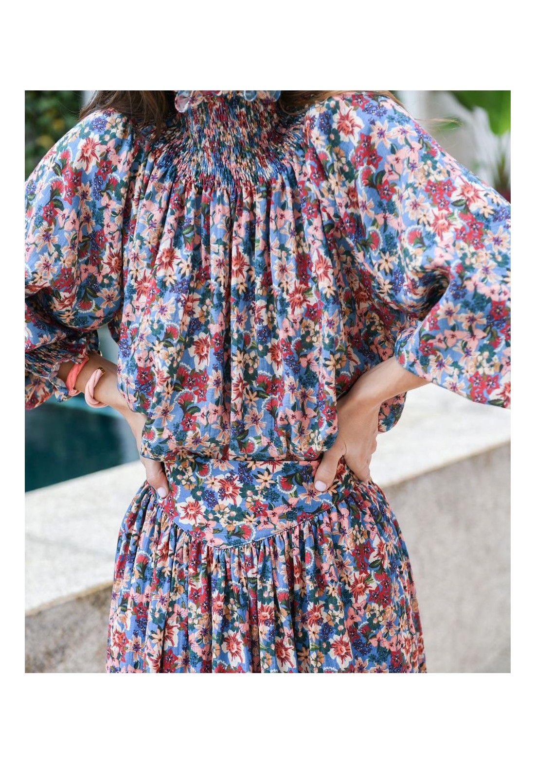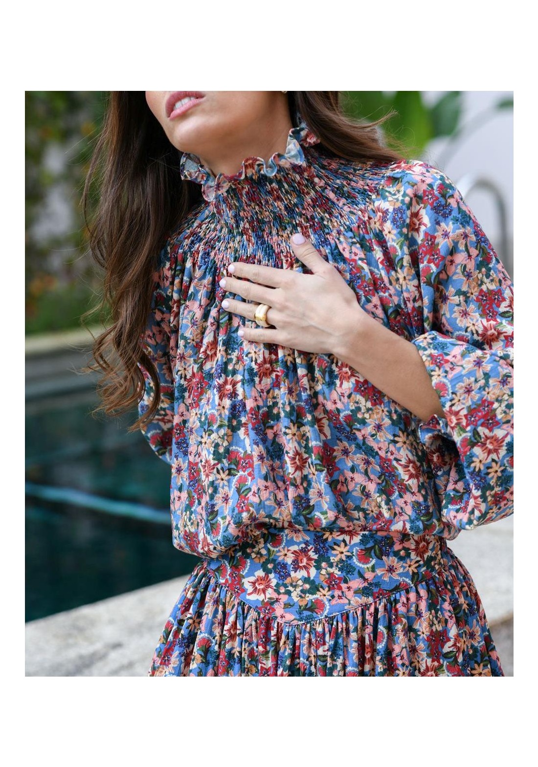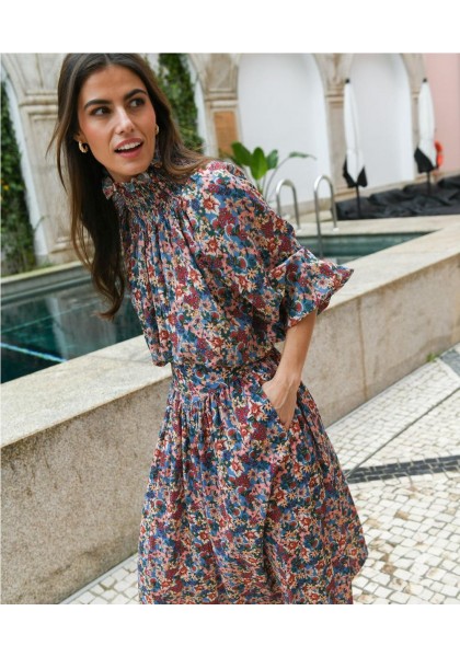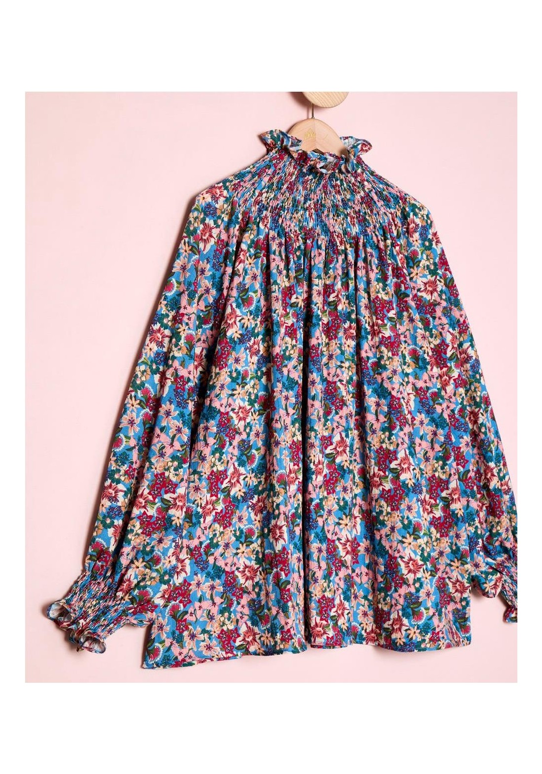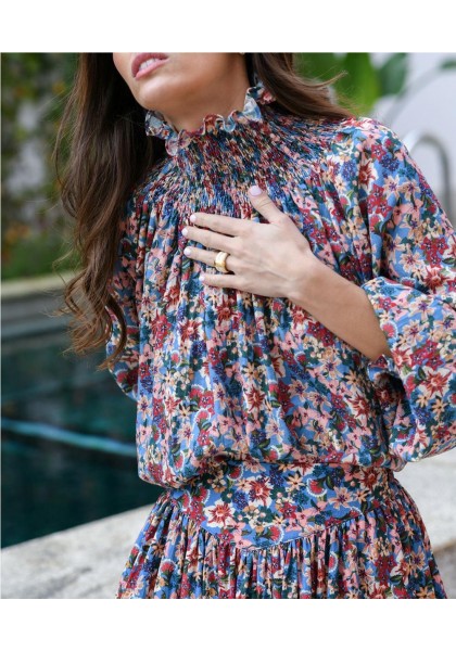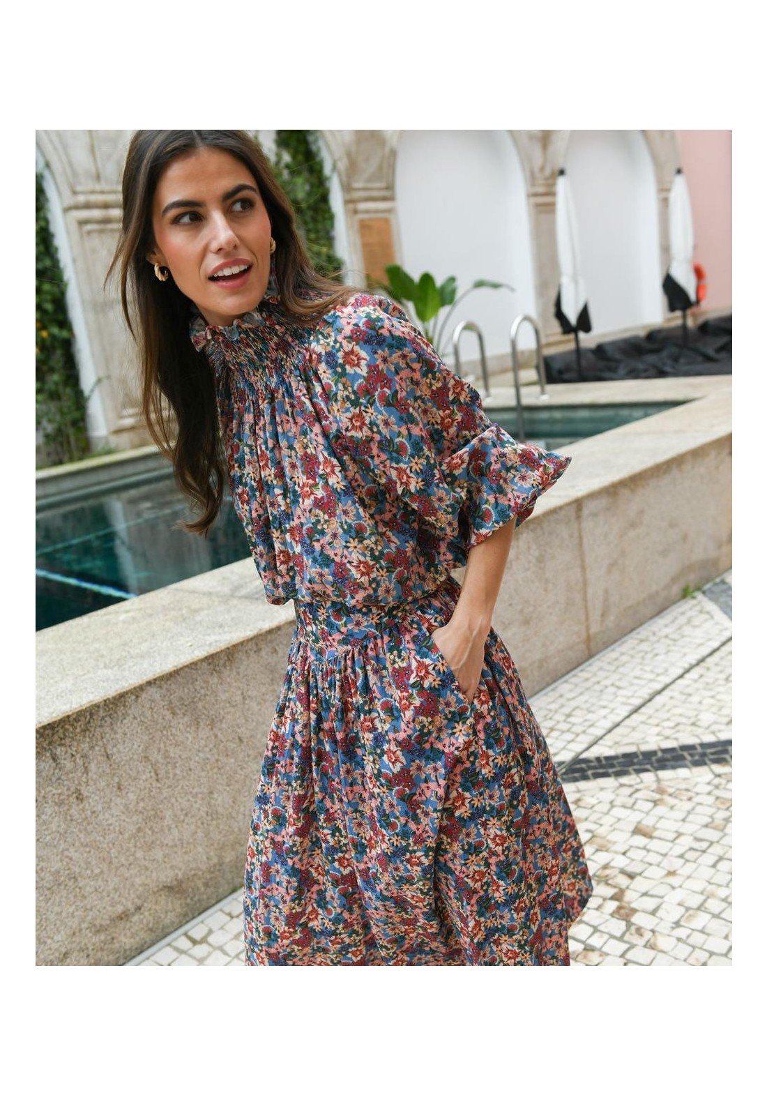 Blusa amplia con cuello fruncido y estampado floral. De manga abullonada y puño elástico, esta prenda combina comodidad con un estilo romántico y sofisticado. Su silueta fluida cae con movimiento natural, mientras que el detalle del cuello aporta un aire elegante y femenino. Confeccionada en 80% viscosa y 20% poliamida.
