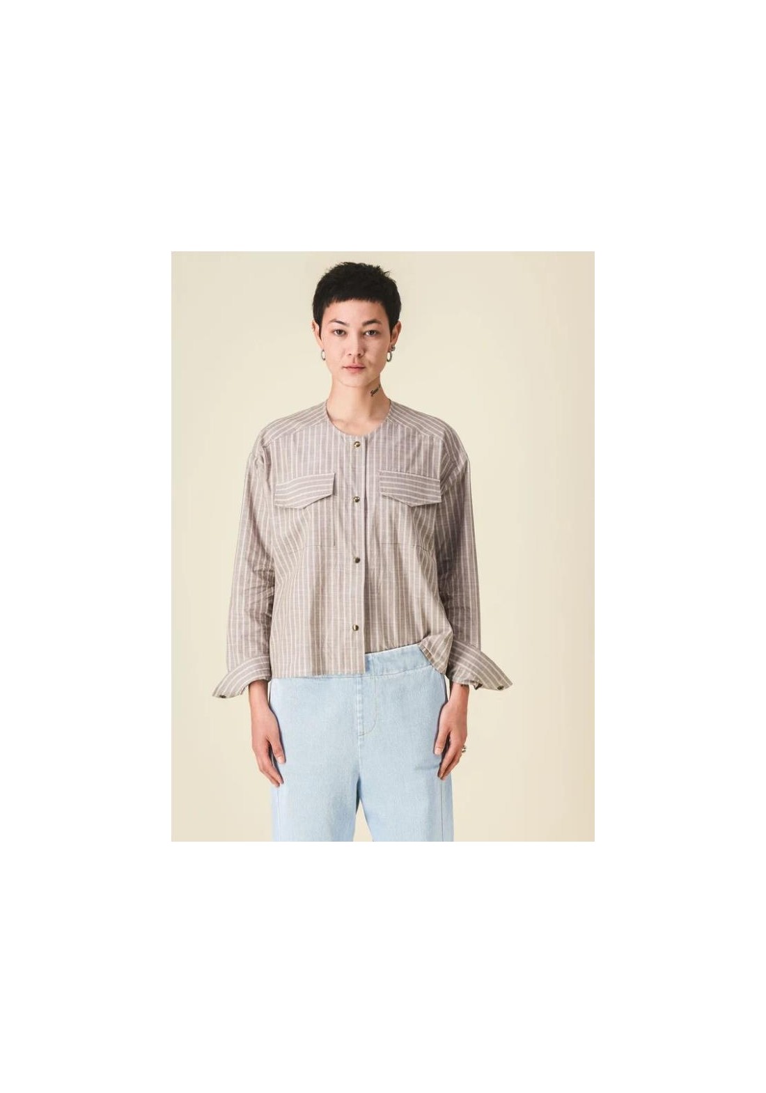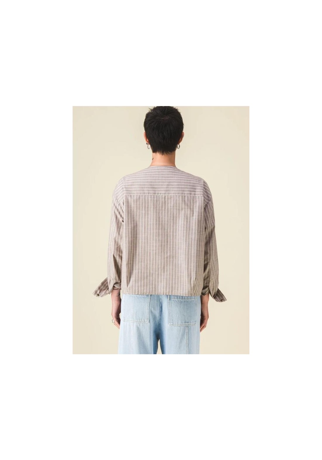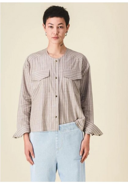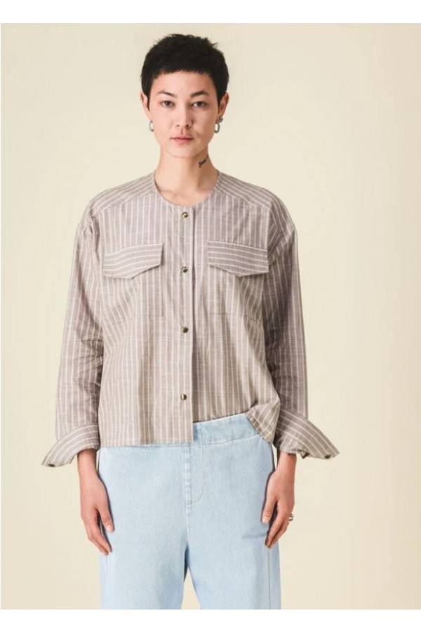 Camisa de cuello redondo con cierre de botones a presión en popelina a rayas beige y blancas, con silueta redondeada gracias a las pinzas en la parte baja de la espalda. Canesú en los hombros, bolsillos de parche con solapa en la parte delantera, hombros caídos con puños abotonados. Hecha en París.