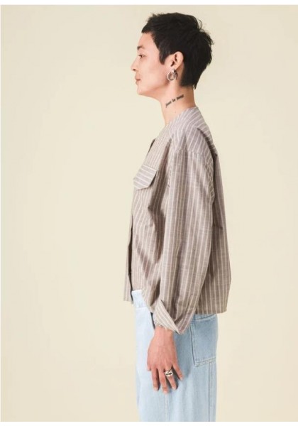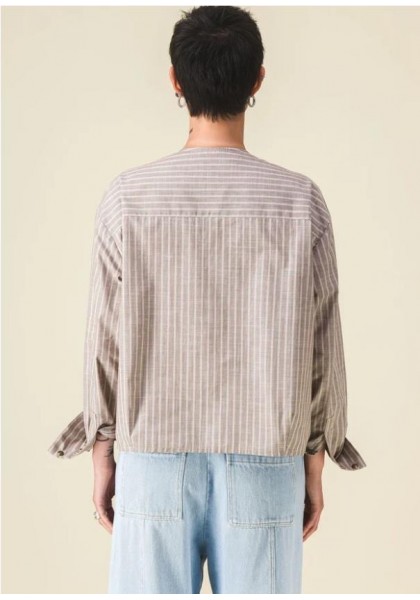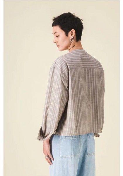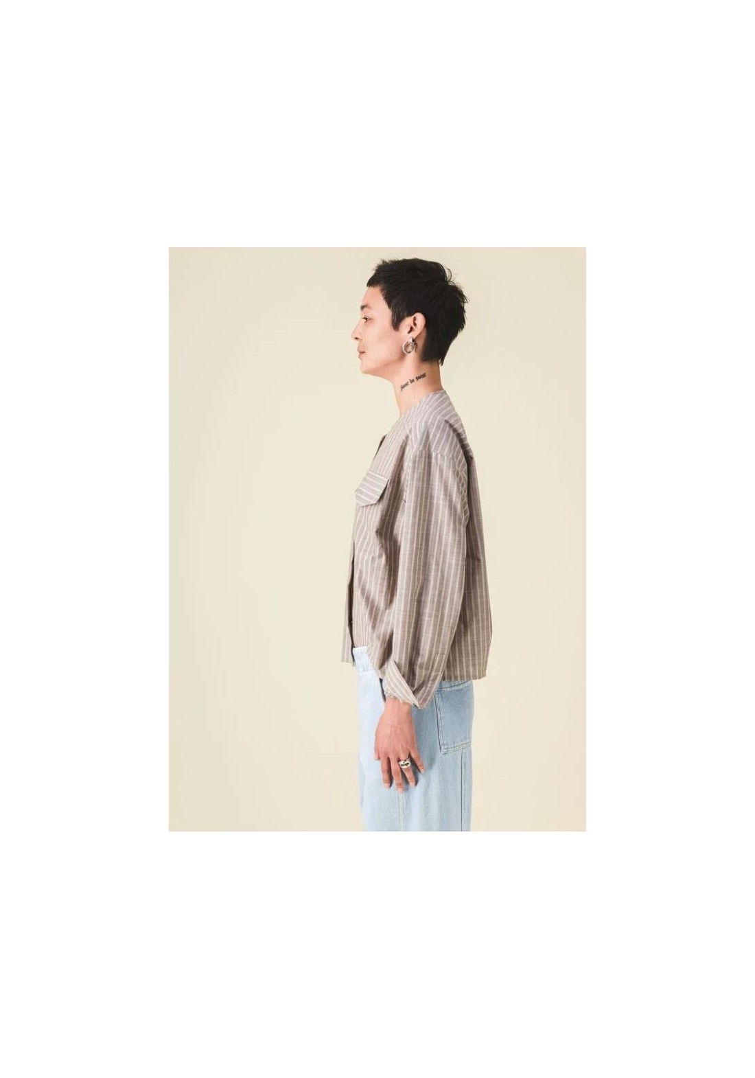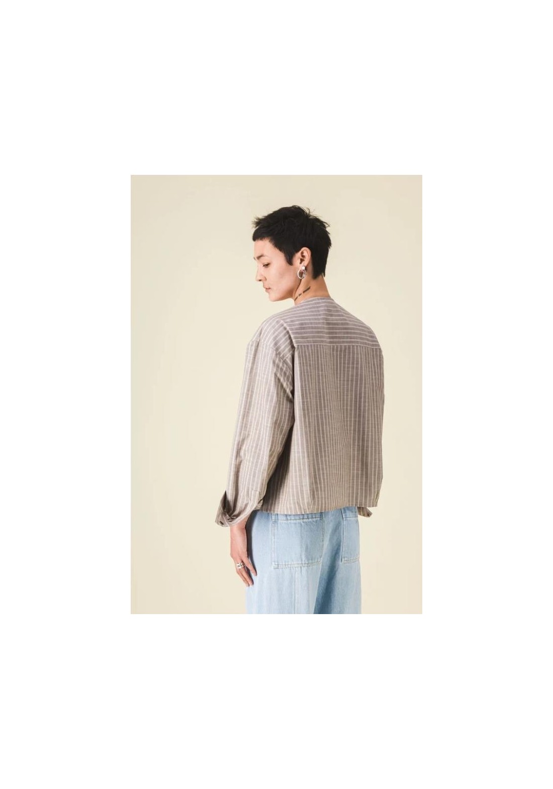 Camisa de cuello redondo con cierre de botones a presión en popelina a rayas beige y blancas, con silueta redondeada gracias a las pinzas en la parte baja de la espalda. Canesú en los hombros, bolsillos de parche con solapa en la parte delantera, hombros caídos con puños abotonados. Hecha en París.