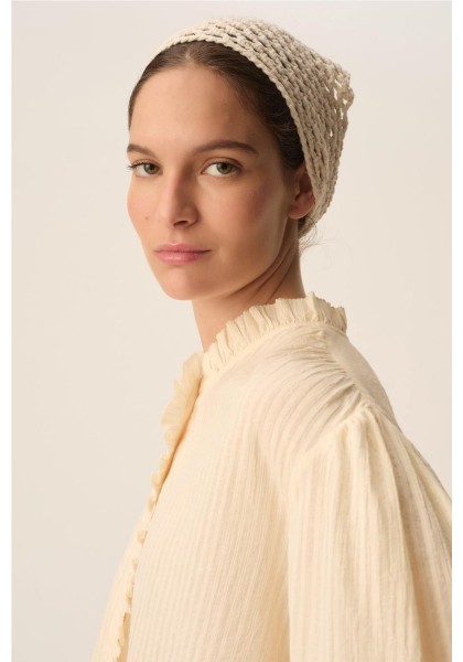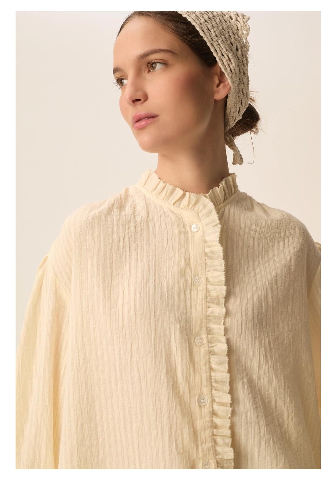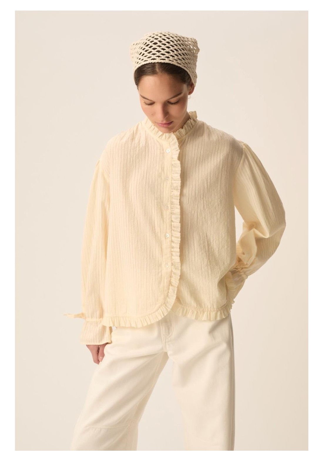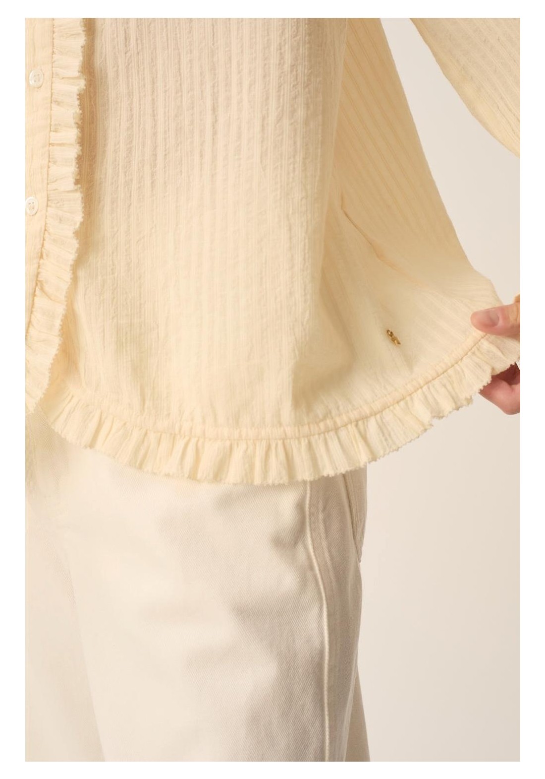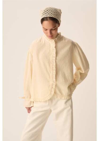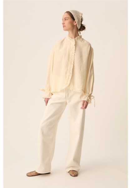 Combinando romanticismo y elegancia, la blusa Toluca cautiva con su estilo moderno. Confeccionada en algodón a rayas de tejido fino, en un sutil estilo casi liso, sus puños ajustados y la tapeta con volantes le dan estructura, convirtiéndola en la prenda perfecta para la primavera. • Blusa de manga larga, 100 % algodón • Corte recto • Cuello redondo • Puños fruncidos con cordón ajustable • Tapeta frontal con botones • Cuello, tapeta y bajo con volante fruncido • Fruncido en hombros, sisas y esp