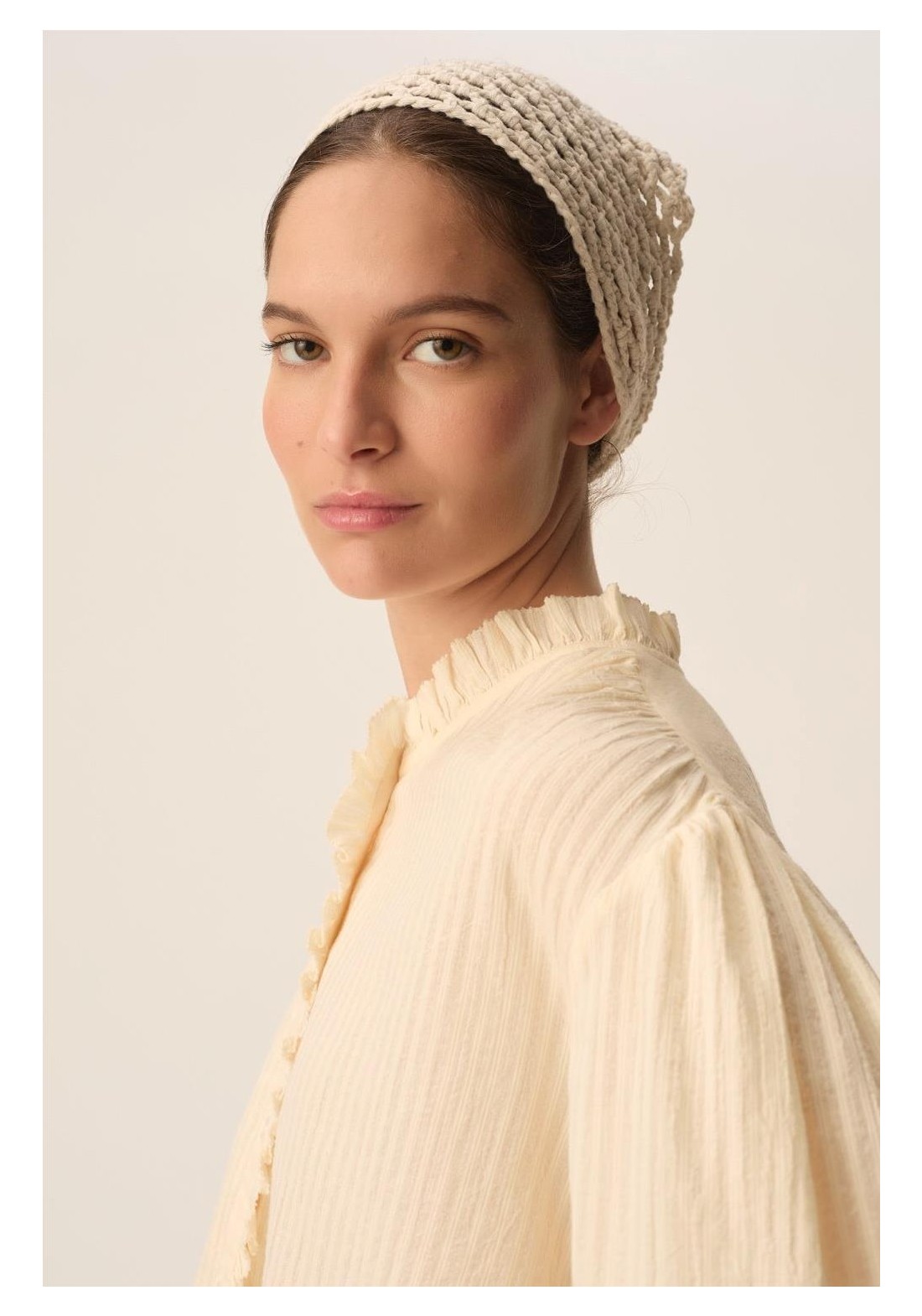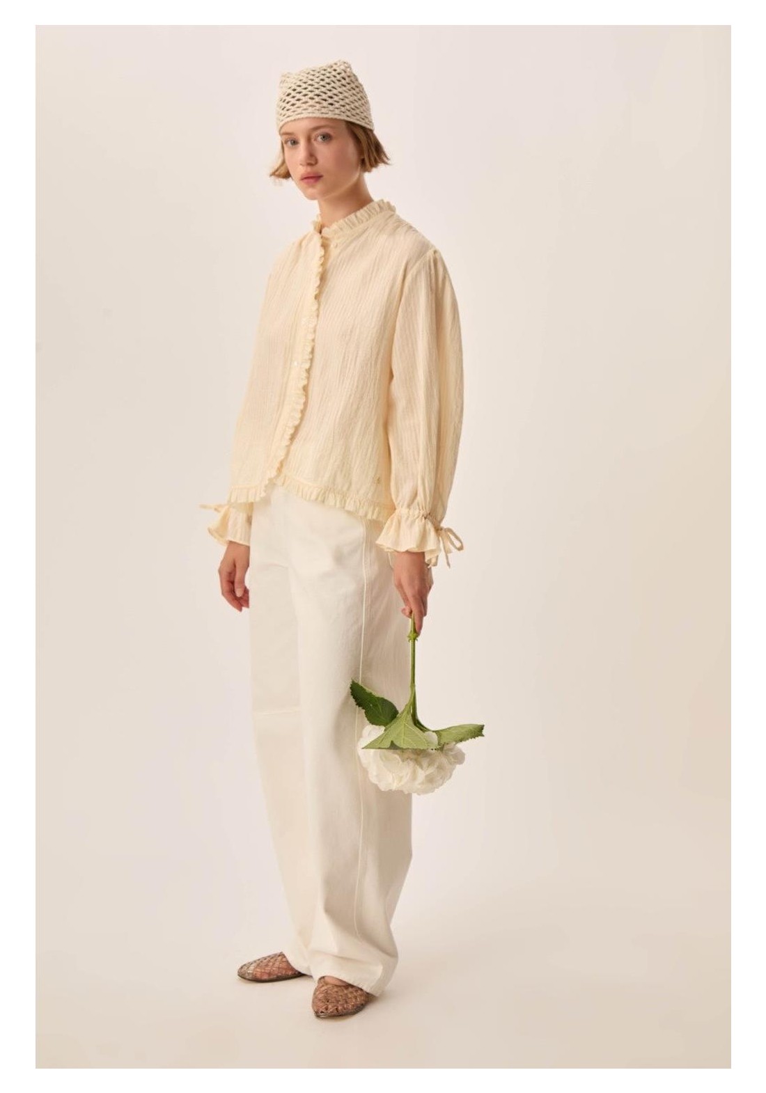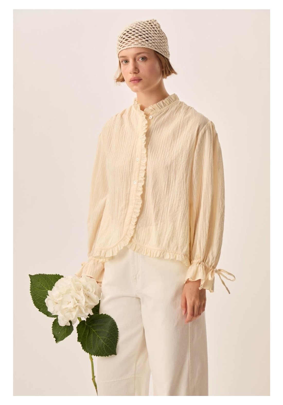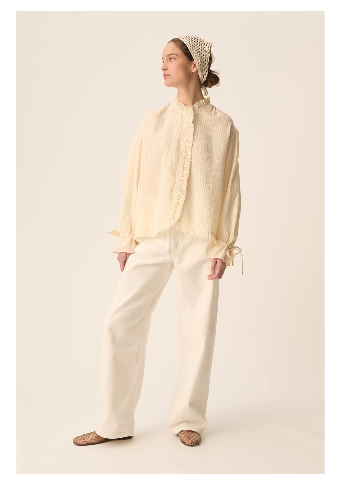 Combinando romanticismo y elegancia, la blusa Toluca cautiva con su estilo moderno. Confeccionada en algodón a rayas de tejido fino, en un sutil estilo casi liso, sus puños ajustados y la tapeta con volantes le dan estructura, convirtiéndola en la prenda perfecta para la primavera. • Blusa de manga larga, 100 % algodón • Corte recto • Cuello redondo • Puños fruncidos con cordón ajustable • Tapeta frontal con botones • Cuello, tapeta y bajo con volante fruncido • Fruncido en hombros, sisas y esp