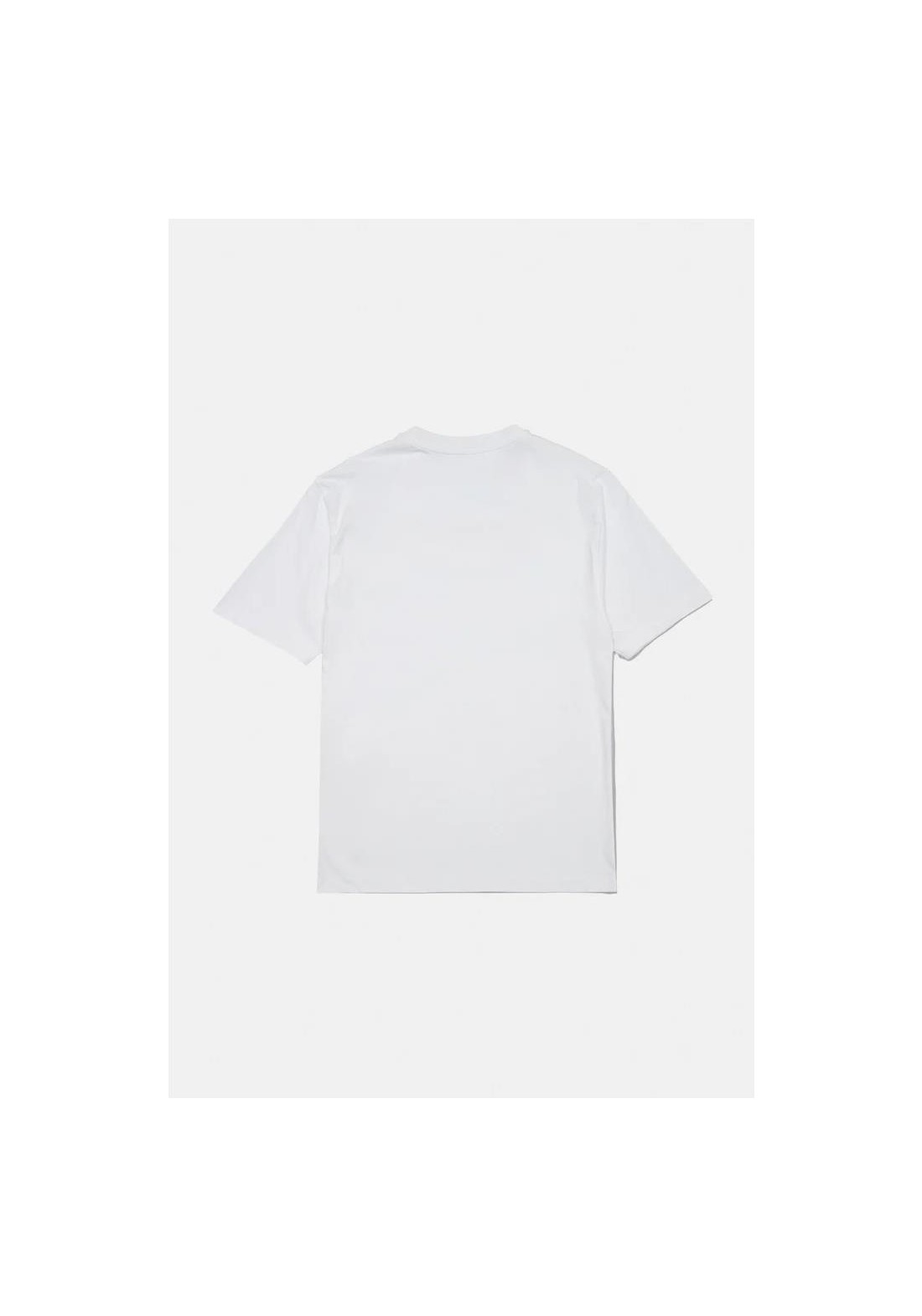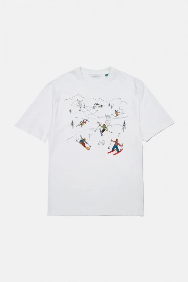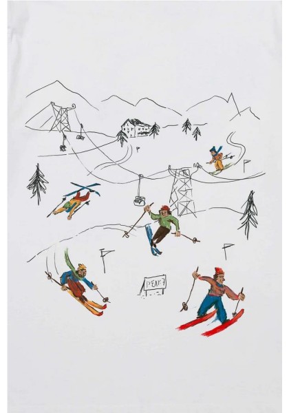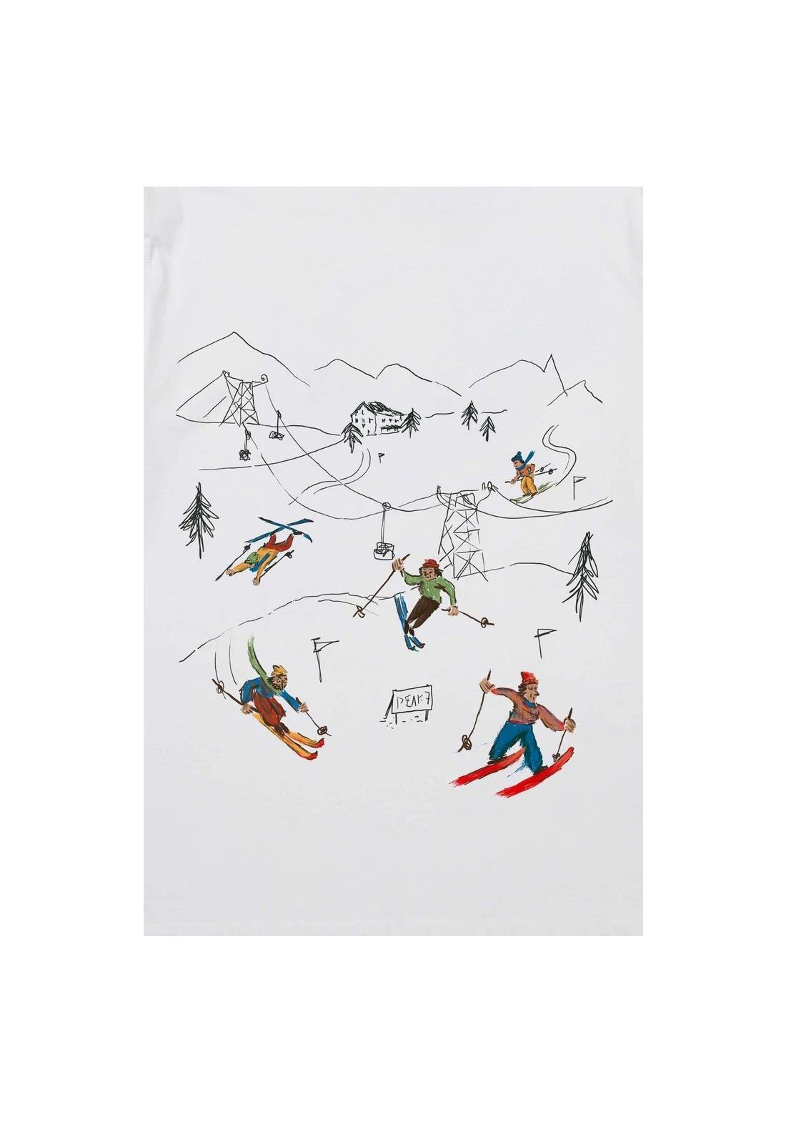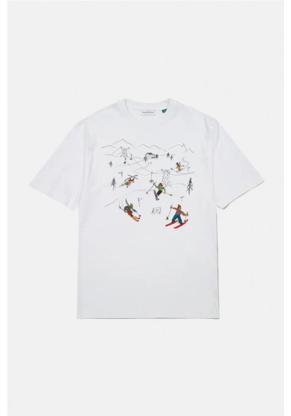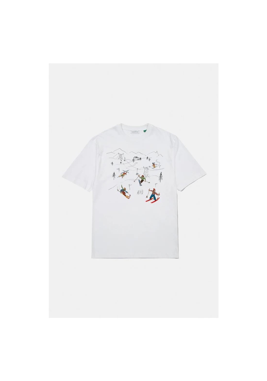 Camiseta blanca de manga corta, fabricada con algodón 100% orgánico. Diseñada con un corte relajado y una longitud perfecta. Presenta una ilustración especial "Peak 7" en la parte frontal que muestra una estación de ski. Fabricada en Portugal.