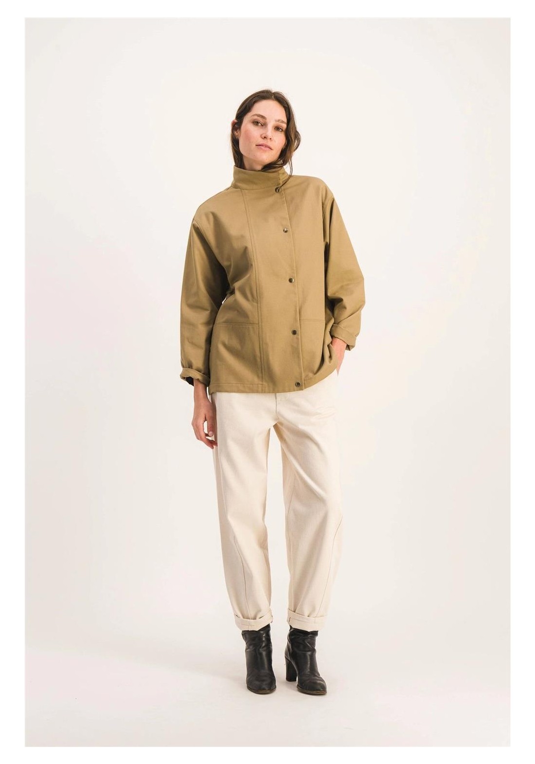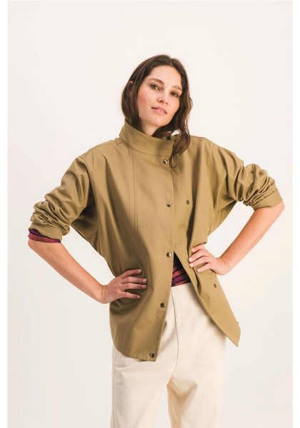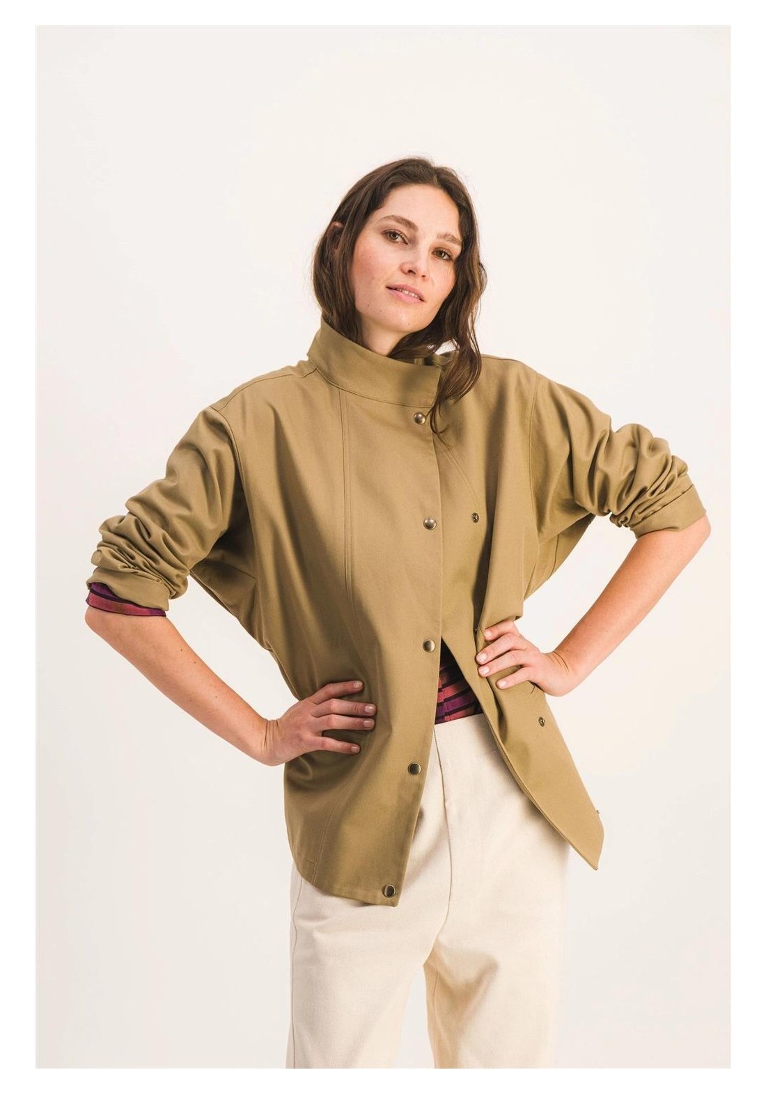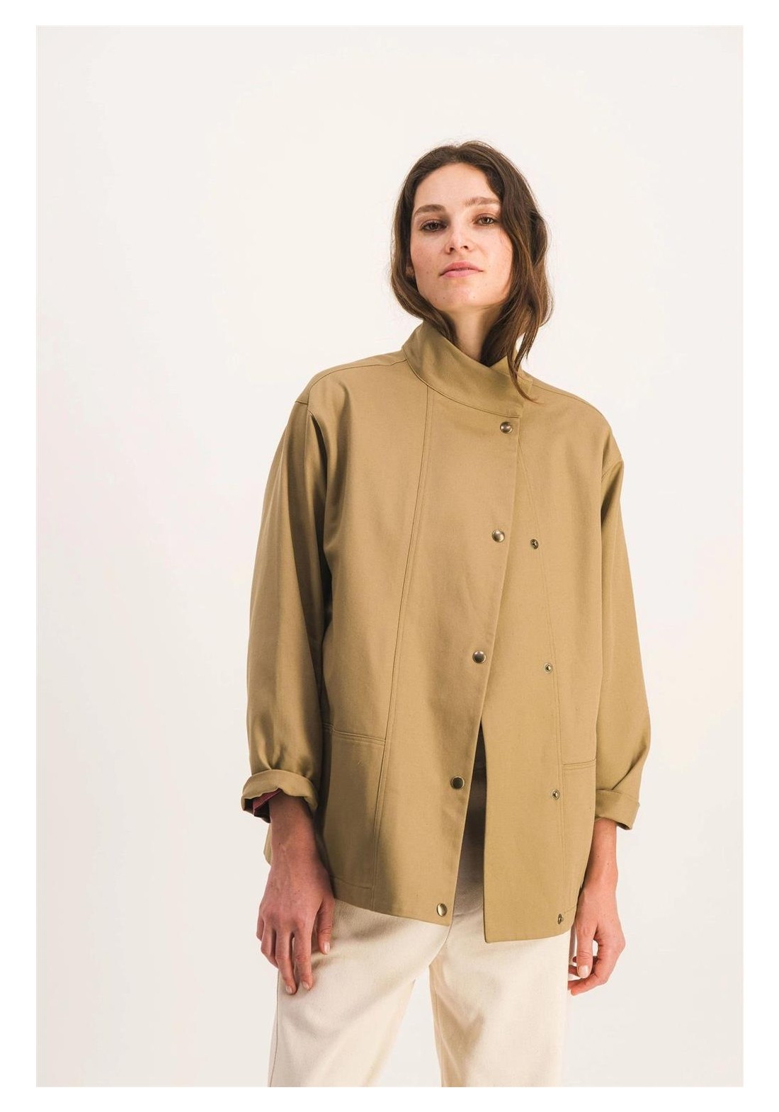Chaqueta de trabajo sin forro en suave algodón. Perfecta para entretiempo. Corte recto, cierre de botones a presión, cuello alto, dos bolsillos de parche en la parte delantera. Gabardina tejida en Francia, color exclusivo. Hecha en Francia. Tejido 100% algodón, fabricado en Francia. Lavar del revés a 30 °C. No usar lejía ni secadora.