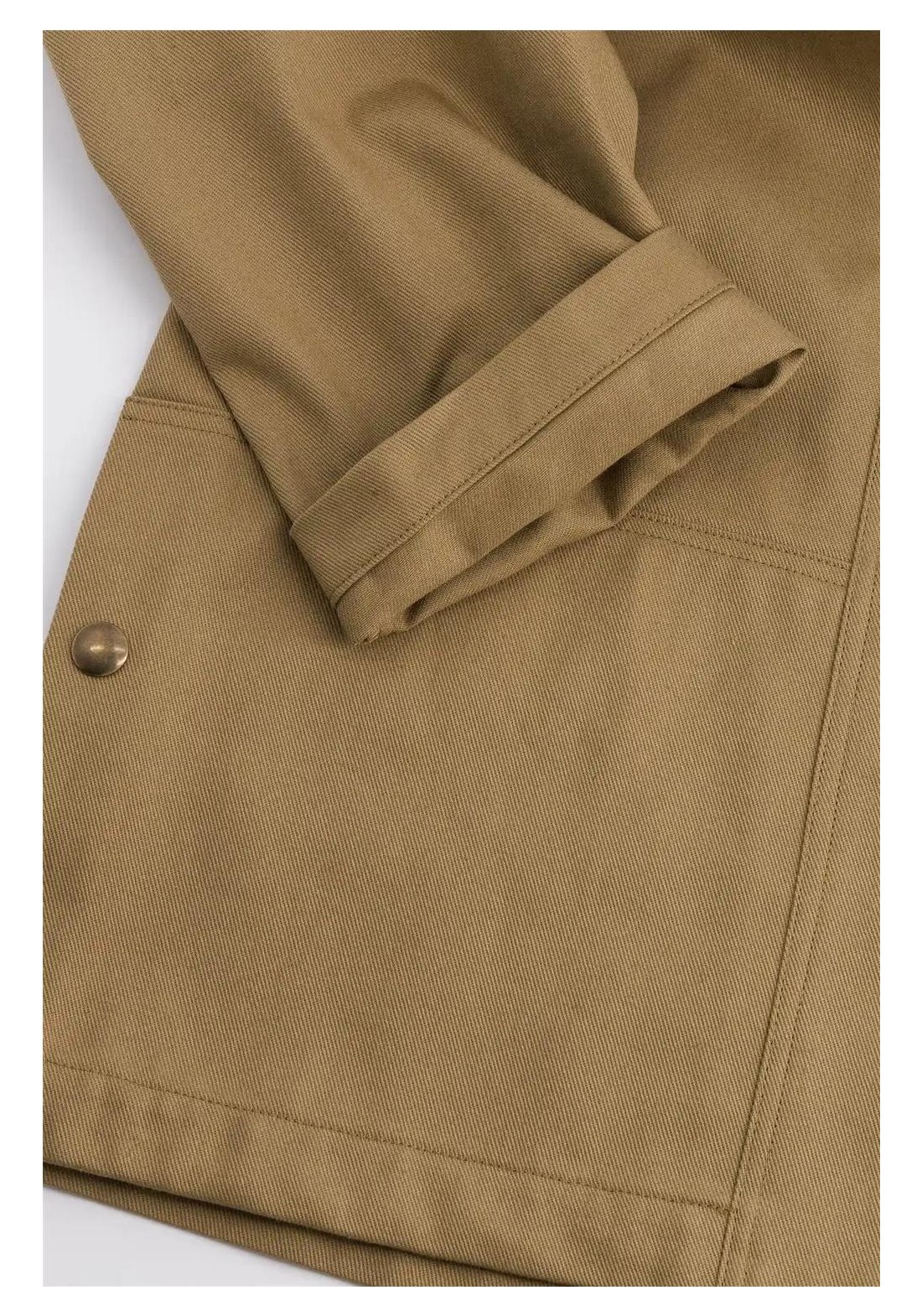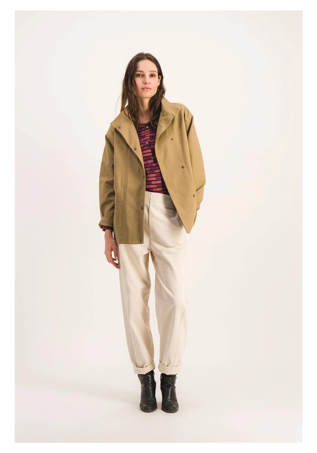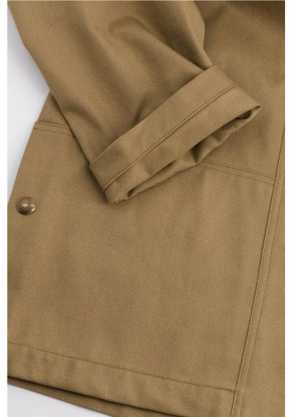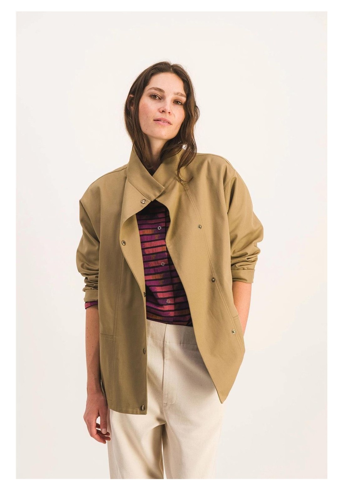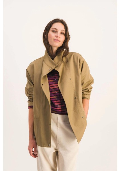 Chaqueta de trabajo sin forro en suave algodón. Perfecta para entretiempo. Corte recto, cierre de botones a presión, cuello alto, dos bolsillos de parche en la parte delantera. Gabardina tejida en Francia, color exclusivo. Hecha en Francia. Tejido 100% algodón, fabricado en Francia. Lavar del revés a 30 °C. No usar lejía ni secadora.