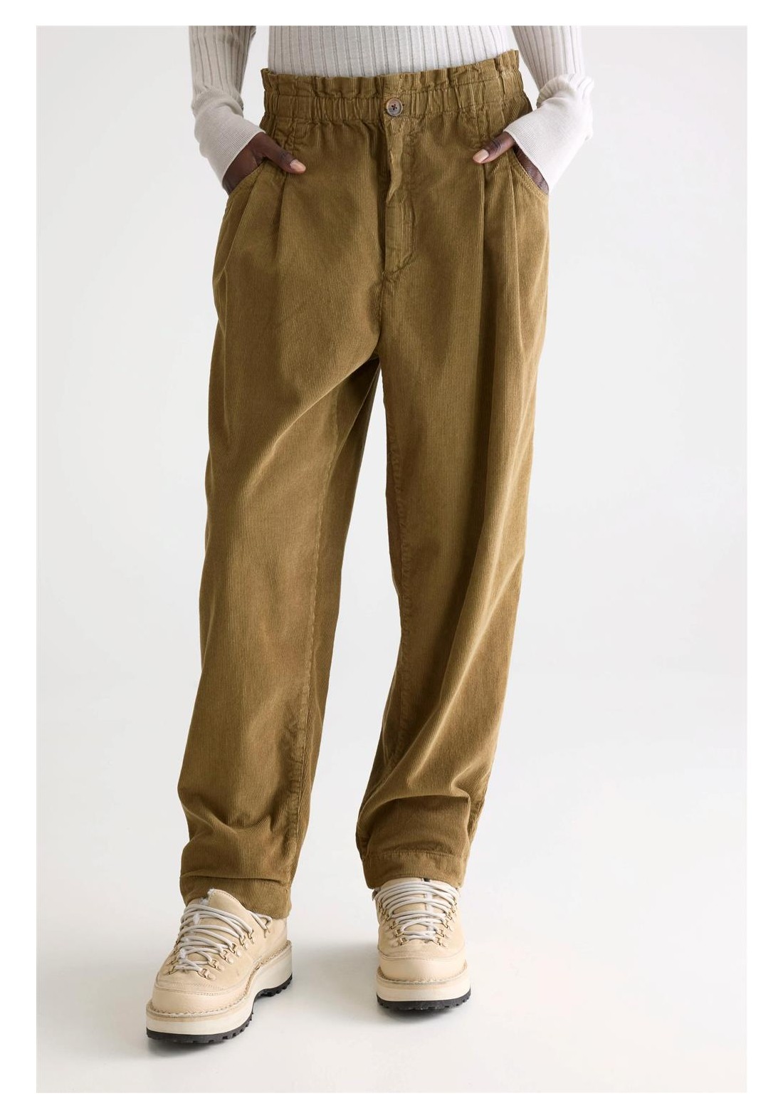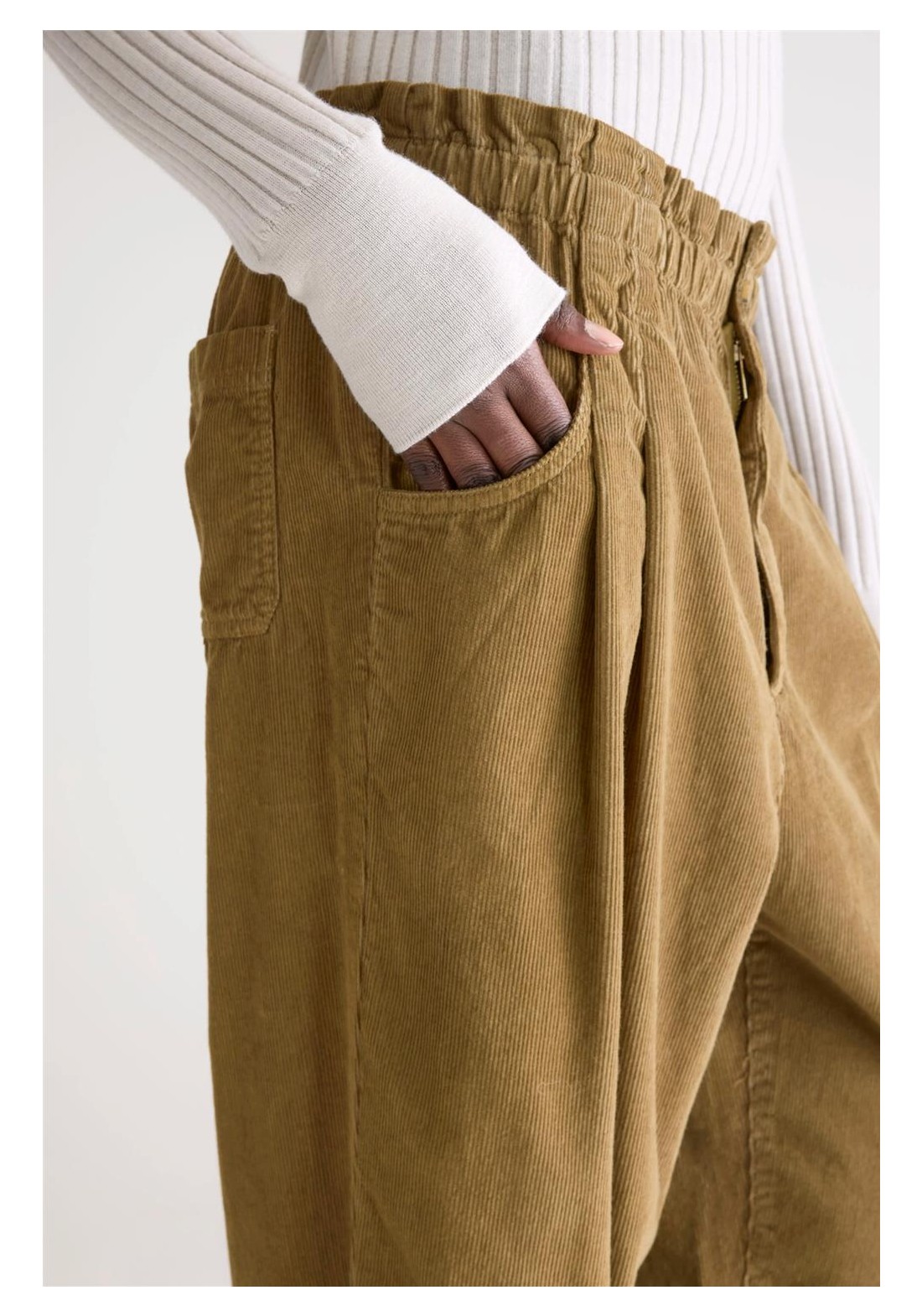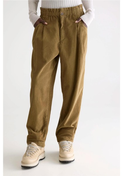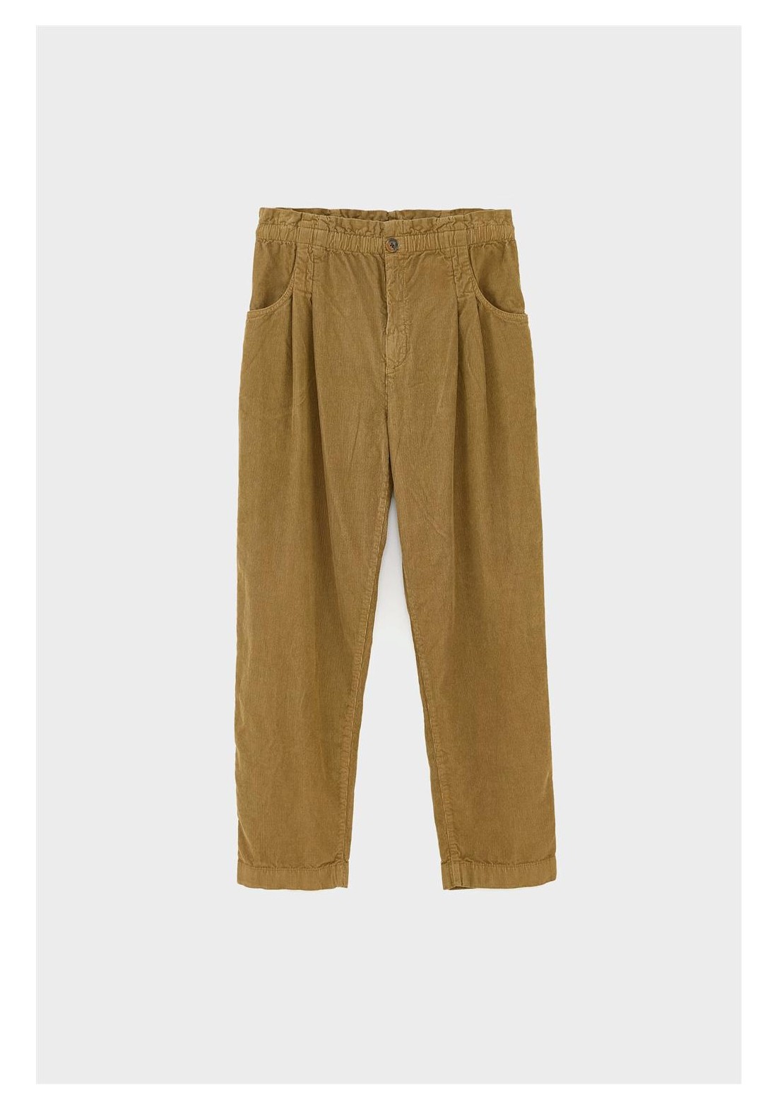 Relaxed fit Tapered legs Paperbag waistband Elasticated waistband Pleated front Side and back pockets Button and zip fly closure
