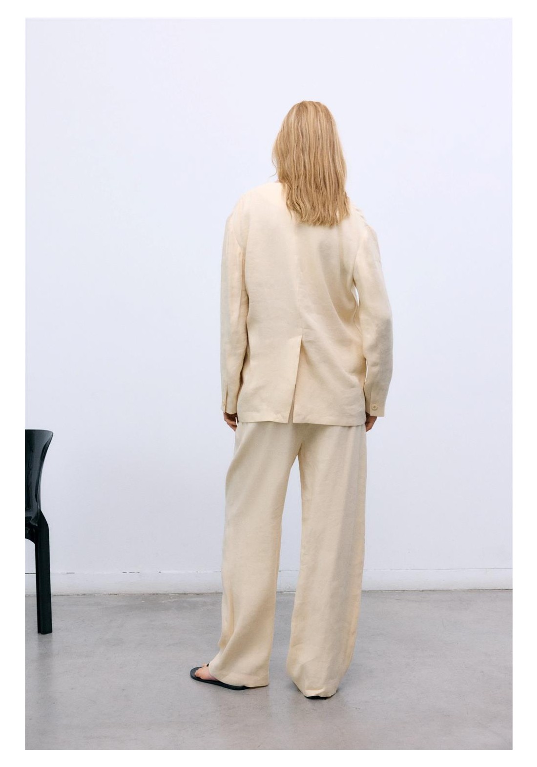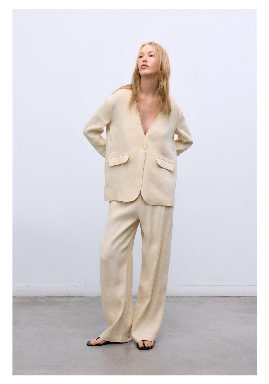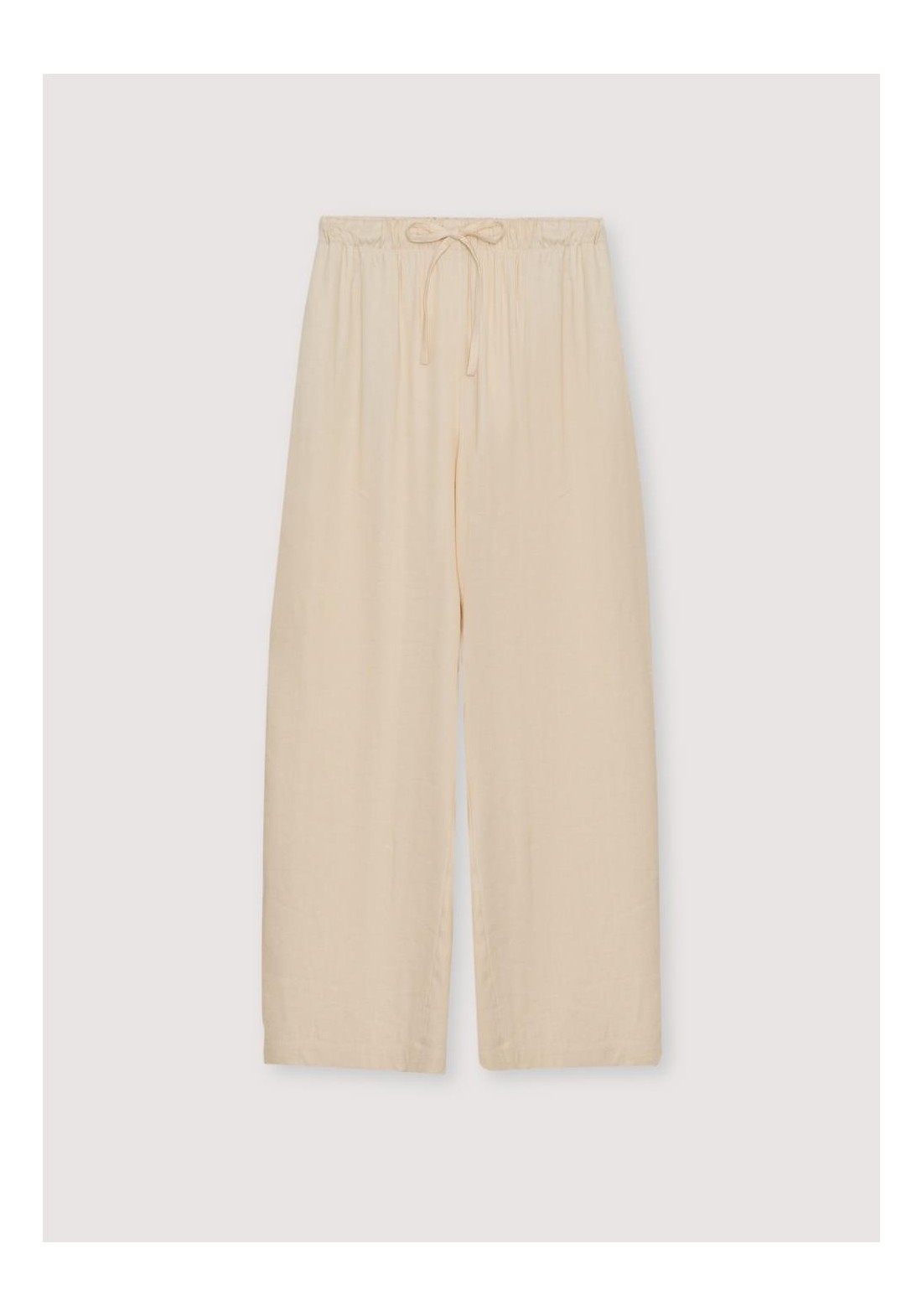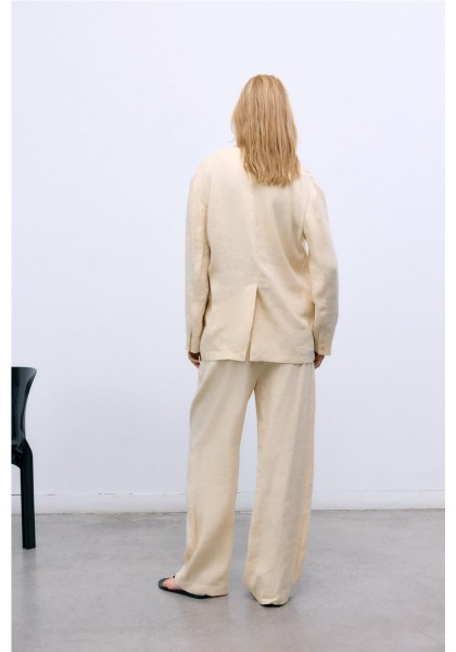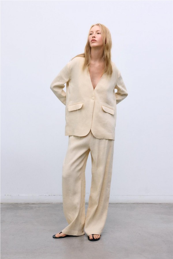 Pantalón ancho estilo jogging confeccionado en una mezcla transpirable de lino y viscosa, con cinturilla ajustable con cordón para mayor comodidad y prácticos bolsillos laterales. Perfecto para combinar con el blazer a juego para un look coordinado relajado pero elegante.