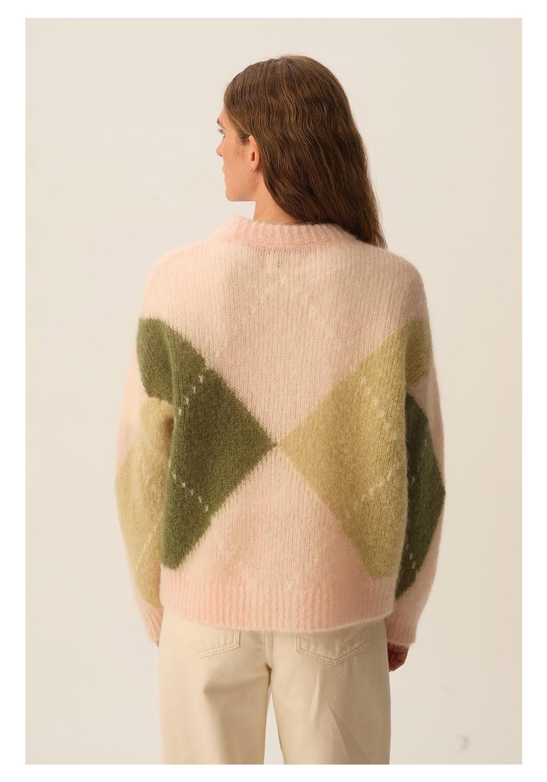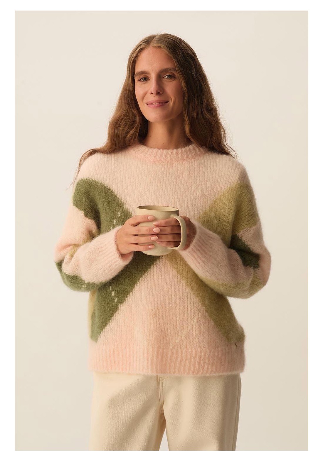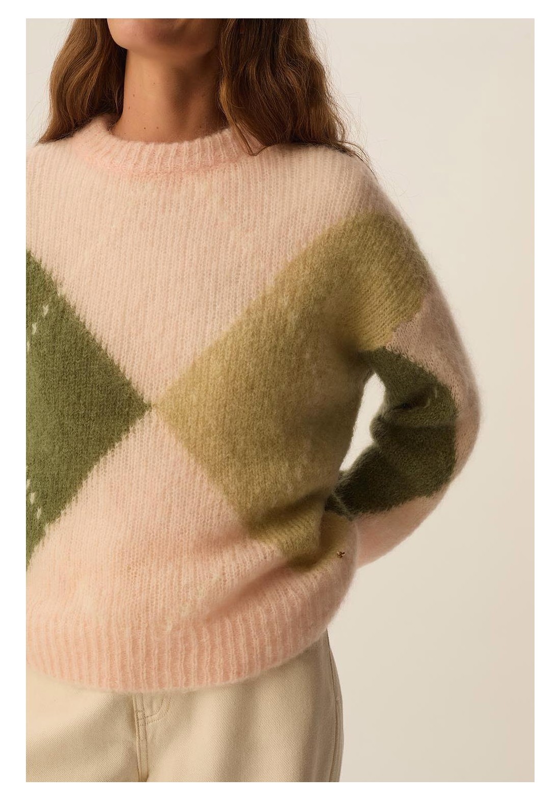 Con su estampado de rombos en intarsia XXL y sus colores suaves, el jersey Bretzel destaca por su corte holgado, creando un look preppy moderno y perfecto. Un estilo icónico para llevar por dentro de vaqueros de cintura alta o debajo de una americana. • Jersey de manga larga en Kid Mohair • Hilo italiano exclusivo de Des Petits Hauts • Corte holgado • Cuello redondo • Sisas descentradas • Ribete de canalé • Punto de intarsia con rombos geométricos • Estampado exclusivo