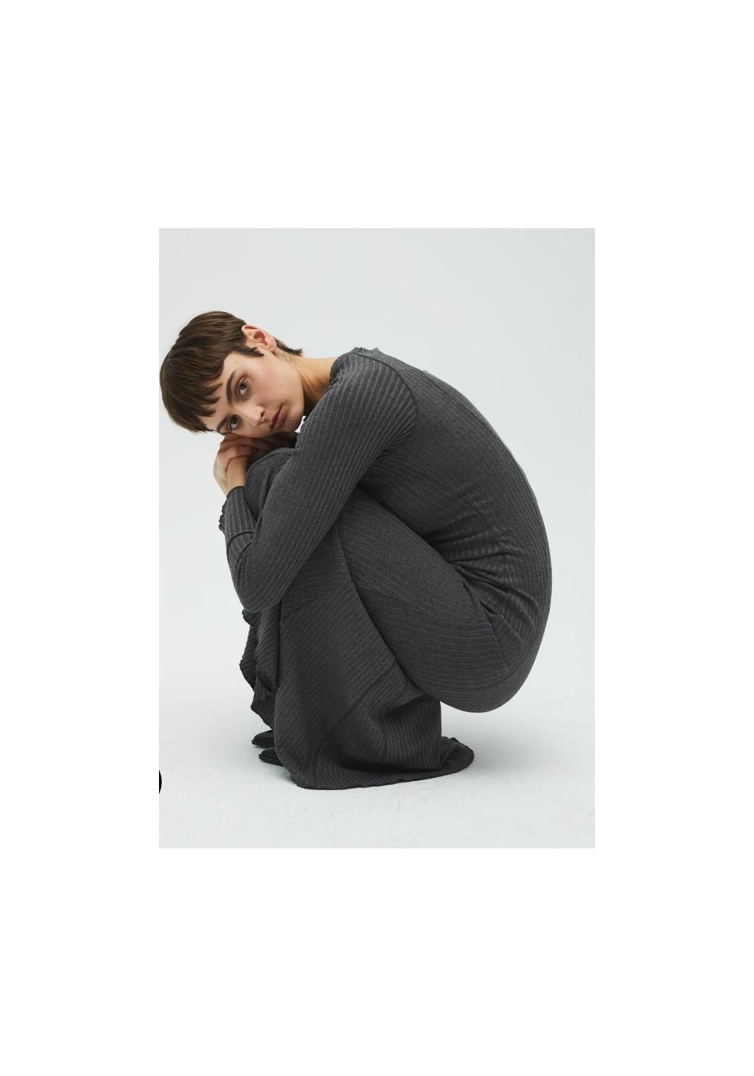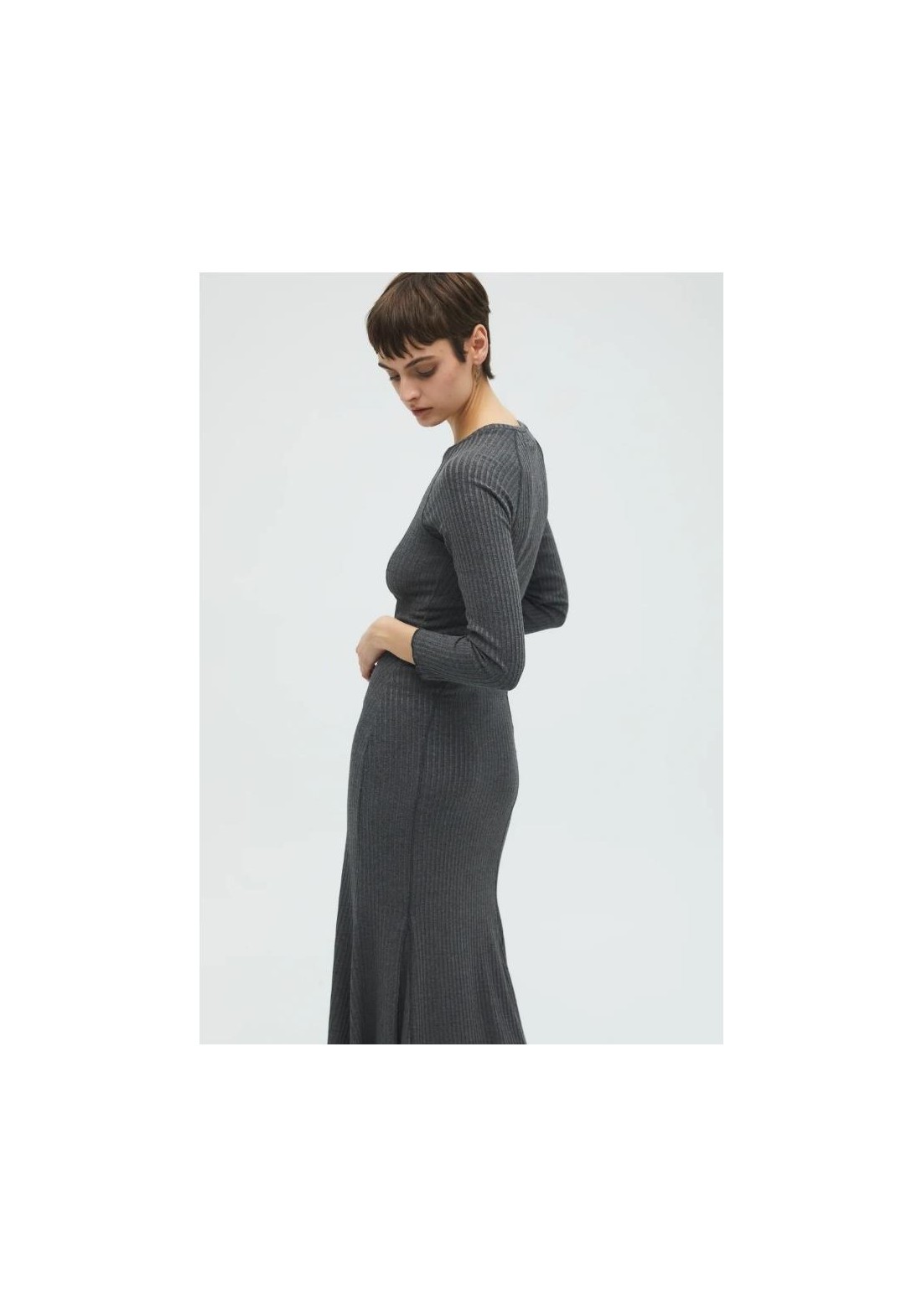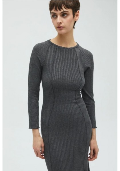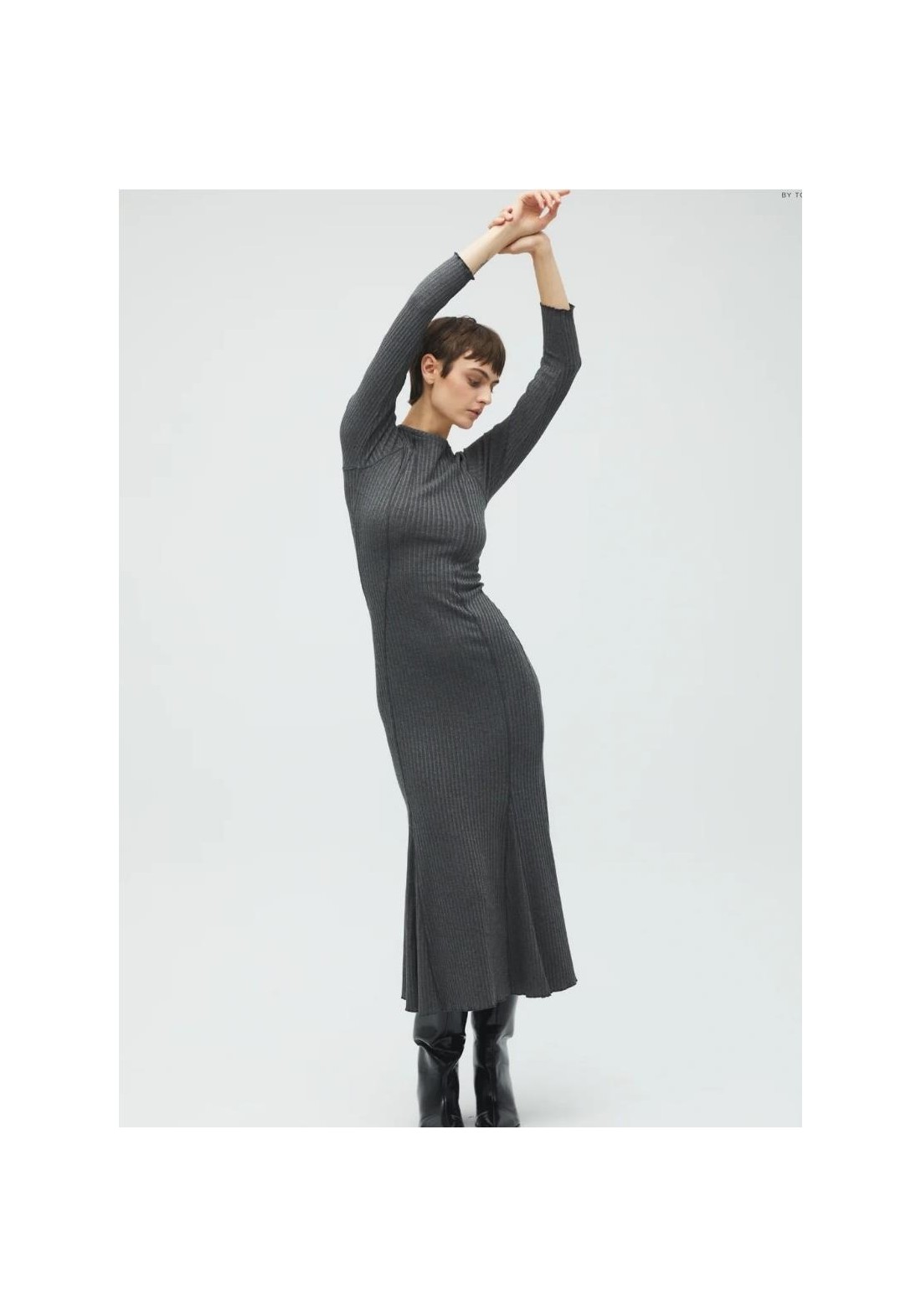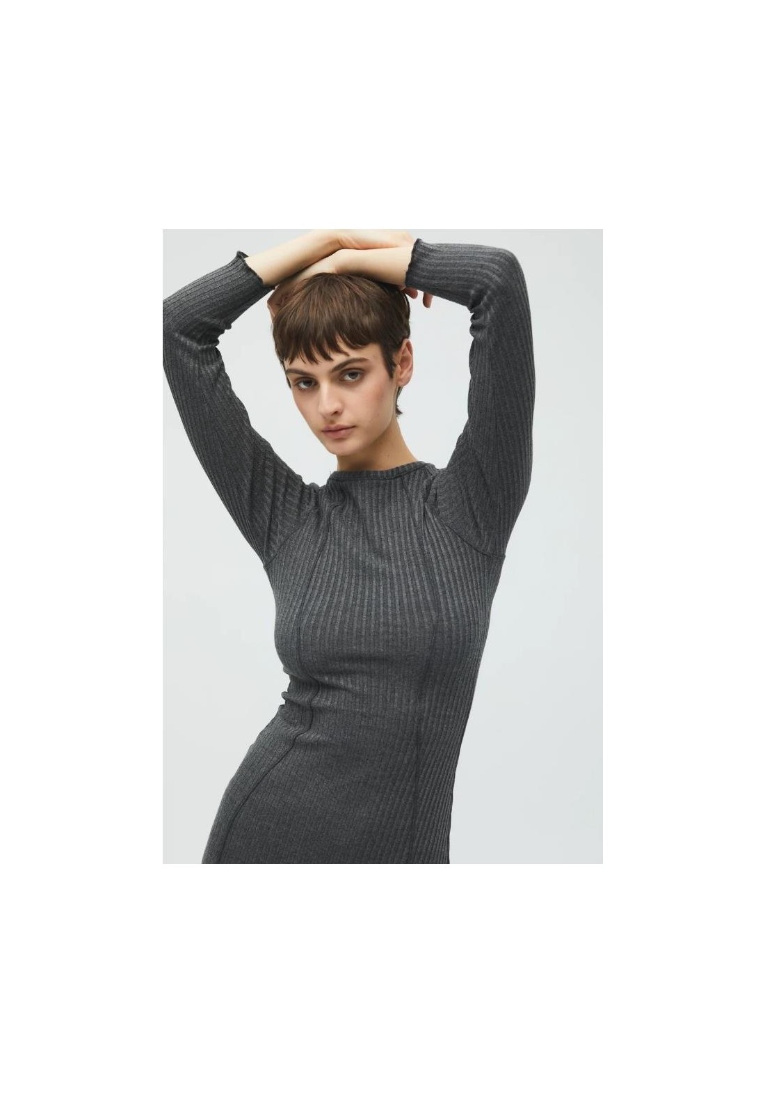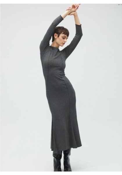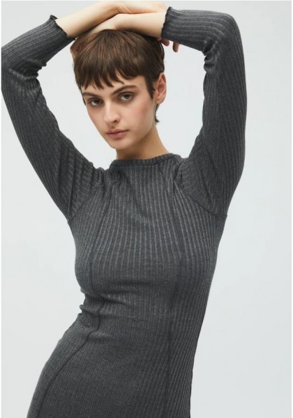 Vestido de manga larga en gris oscuro, con un tejido suave y agradable al tacto que abriga sin resultar pesado. Su caída natural estiliza la figura, ideal para un look elegante y cómodo en invierno.