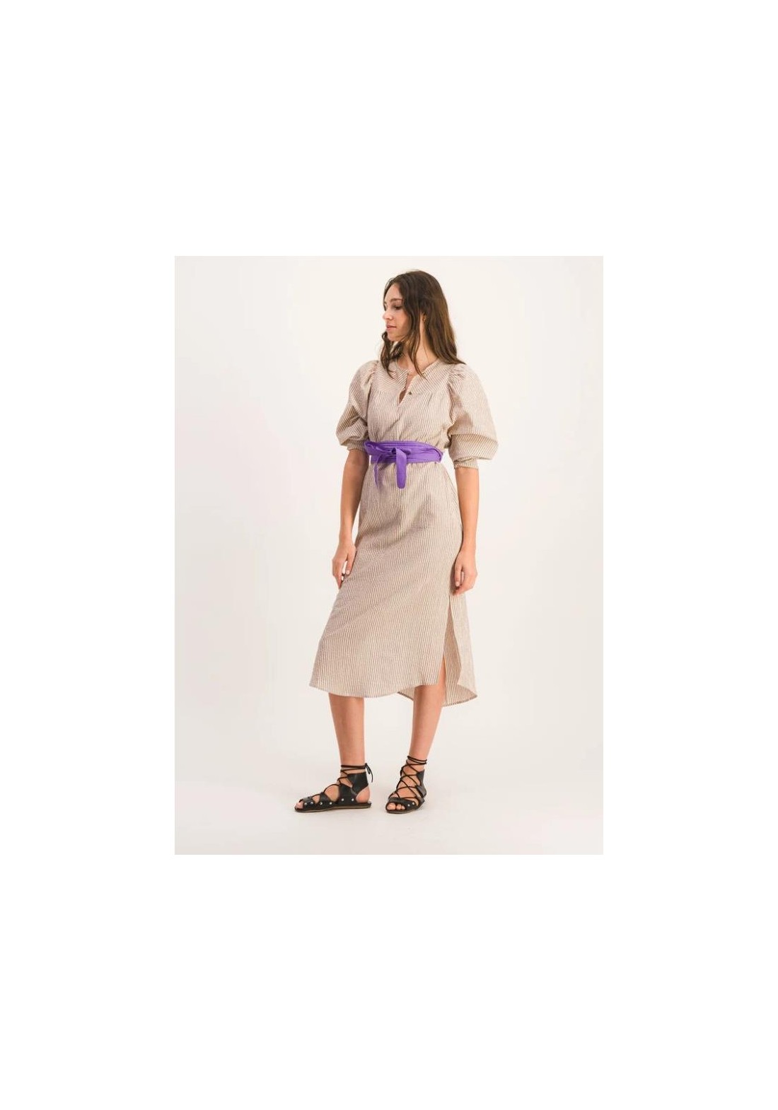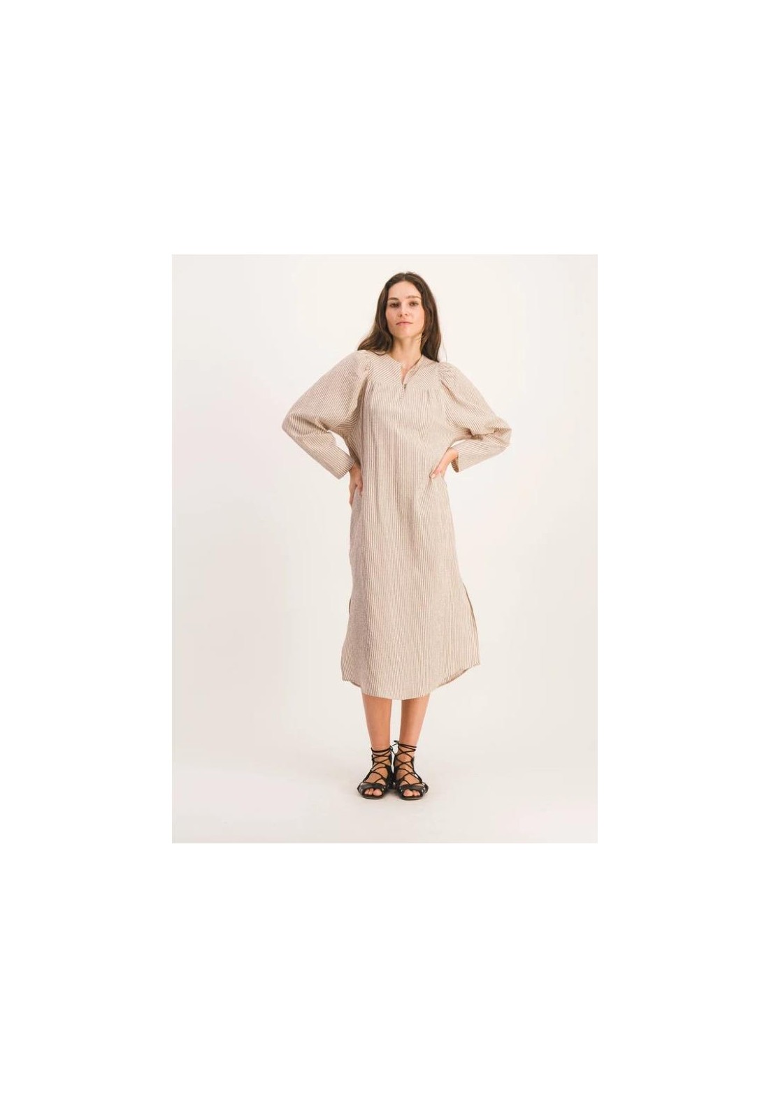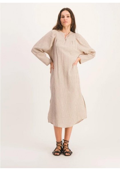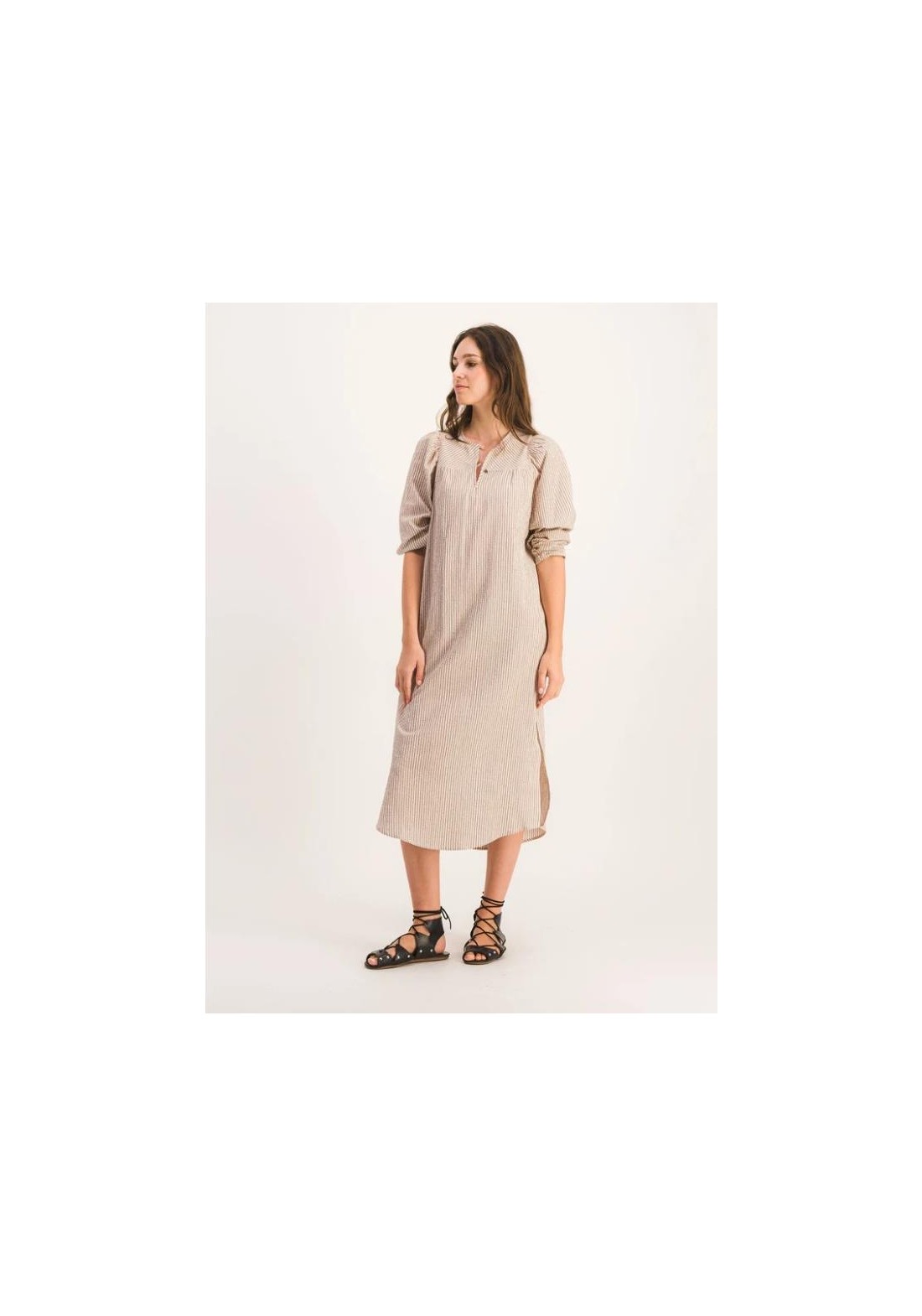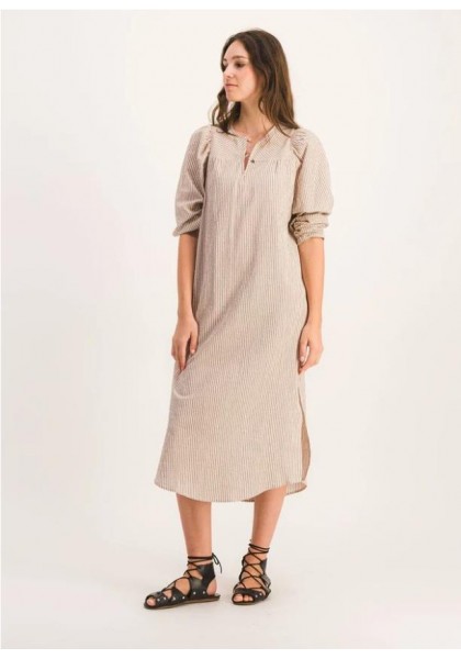 Vestido largo y recto con mangas abullonadas. Canesú delantero estrecho y aberturas laterales. Tejido seersucker a rayas marrones y beige. Hecho en Francia. Composición: 99 % algodón, 1 % elastano. Fabricado en Grecia. Lavar a máquina a 30 °C. No usar lejía ni secadora.