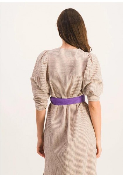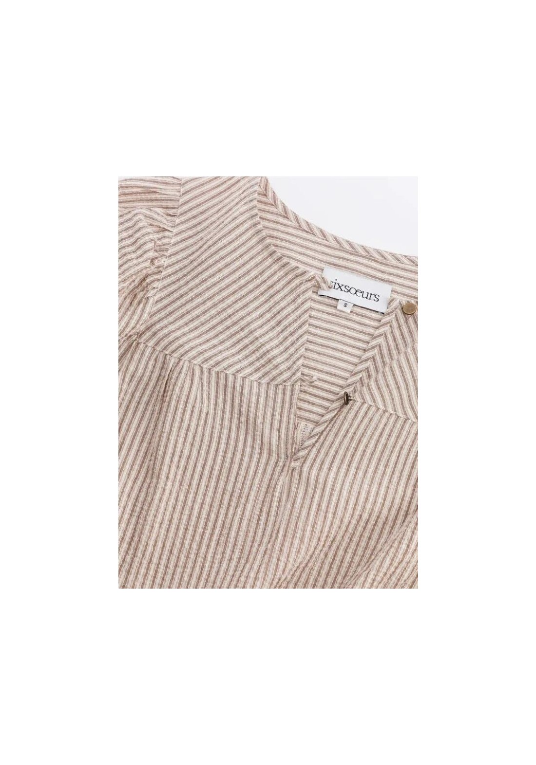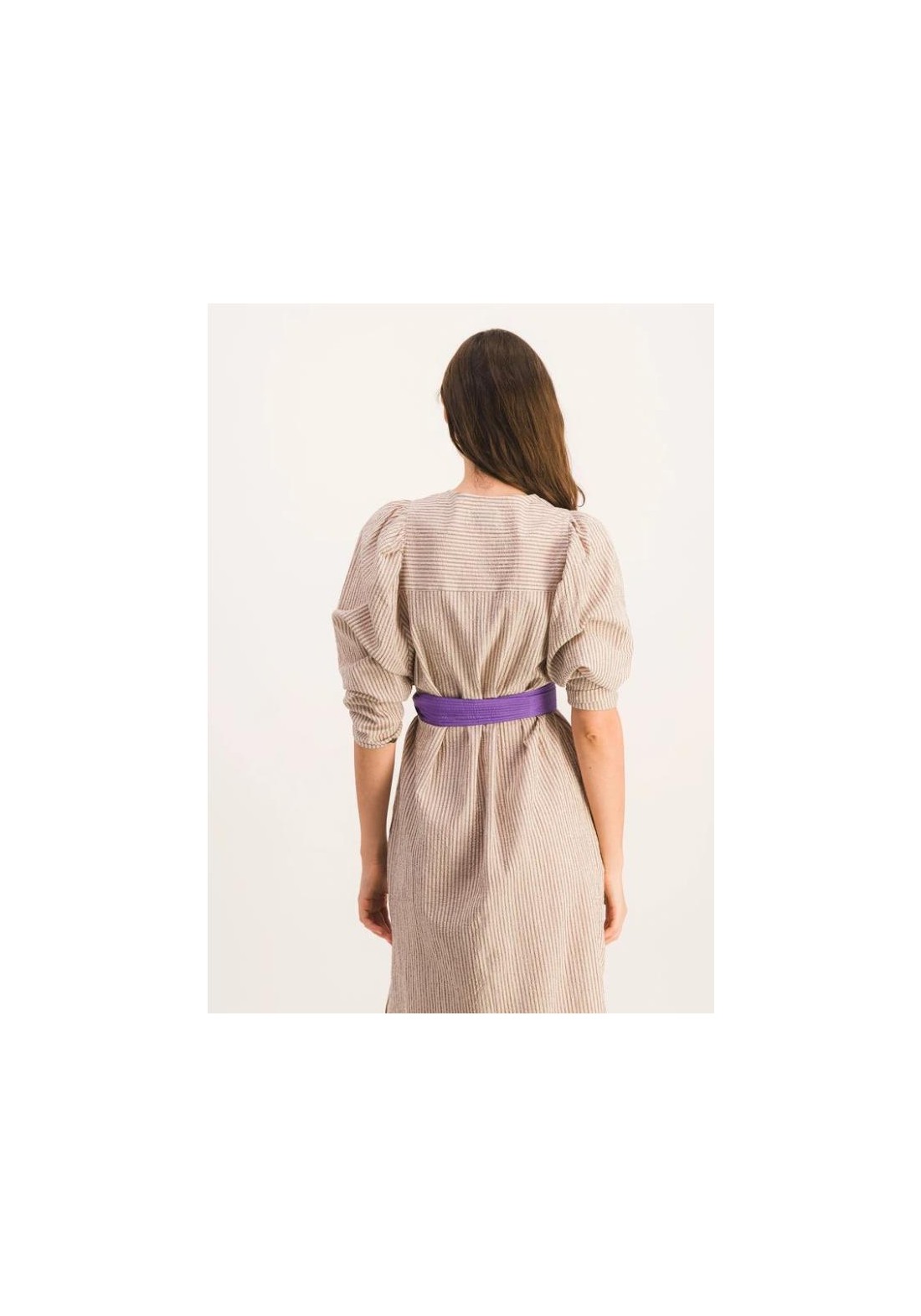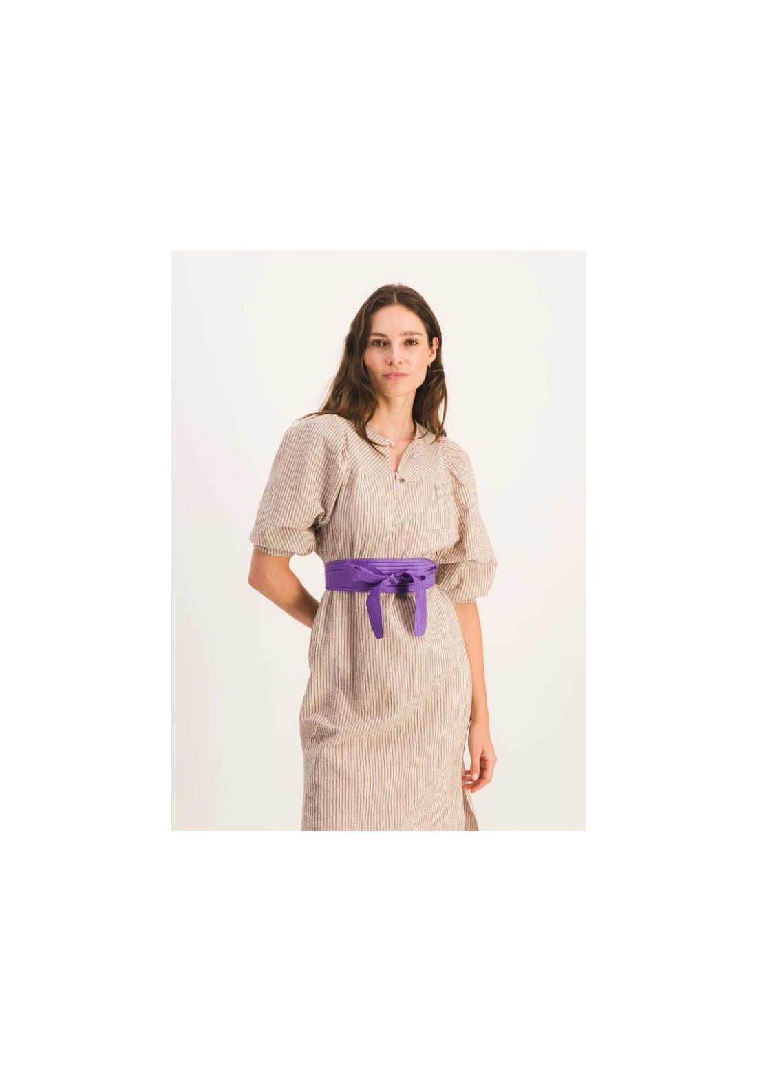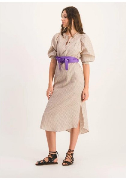 Vestido largo y recto con mangas abullonadas. Canesú delantero estrecho y aberturas laterales. Tejido seersucker a rayas marrones y beige. Hecho en Francia. Composición: 99 % algodón, 1 % elastano. Fabricado en Grecia. Lavar a máquina a 30 °C. No usar lejía ni secadora.